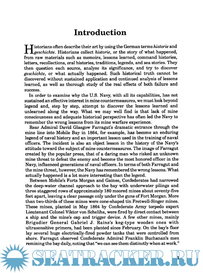 Year: 1991 Language: english Author: Tamara Moser Melia Genre: History Publisher: Naval Historical Center Edition: CONTRIBUTIONS TO NAVAL HISTORY Format: PDF Quality: Scanned pages Pages count: 237 Description: This is an authoritative and thorough history of U.S. Navy mine countermeasures. Mine warfare is by definition the strategic and tactical use of sea mines and their countermeasures, including all offensive and defensive mining and protection against mines. Mining and mine countermeasures (MCM) are, however, two distinctly different operations. The primary focus of modern mining operations is to effect sea control, with secondary missions that neutralize or destroy enemy ships by interdicting enemy sea lines of communication, submarine operating areas, and home ports. Offensively, mines attack enemy ships in transit or bottle them up in their own waters; defensively, mines guard national and international waters against enemy intrusion.