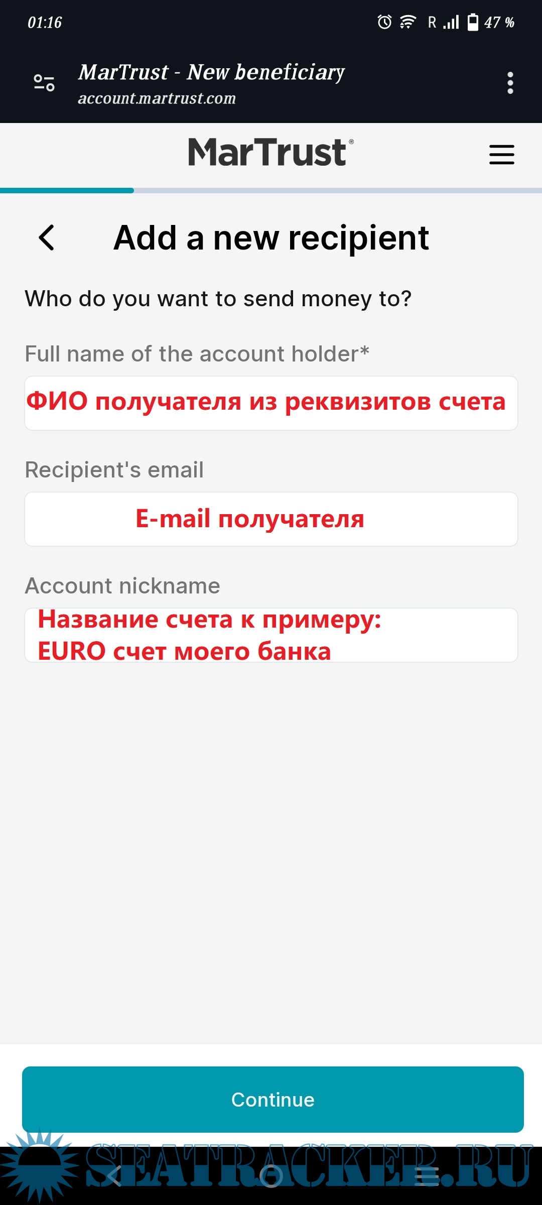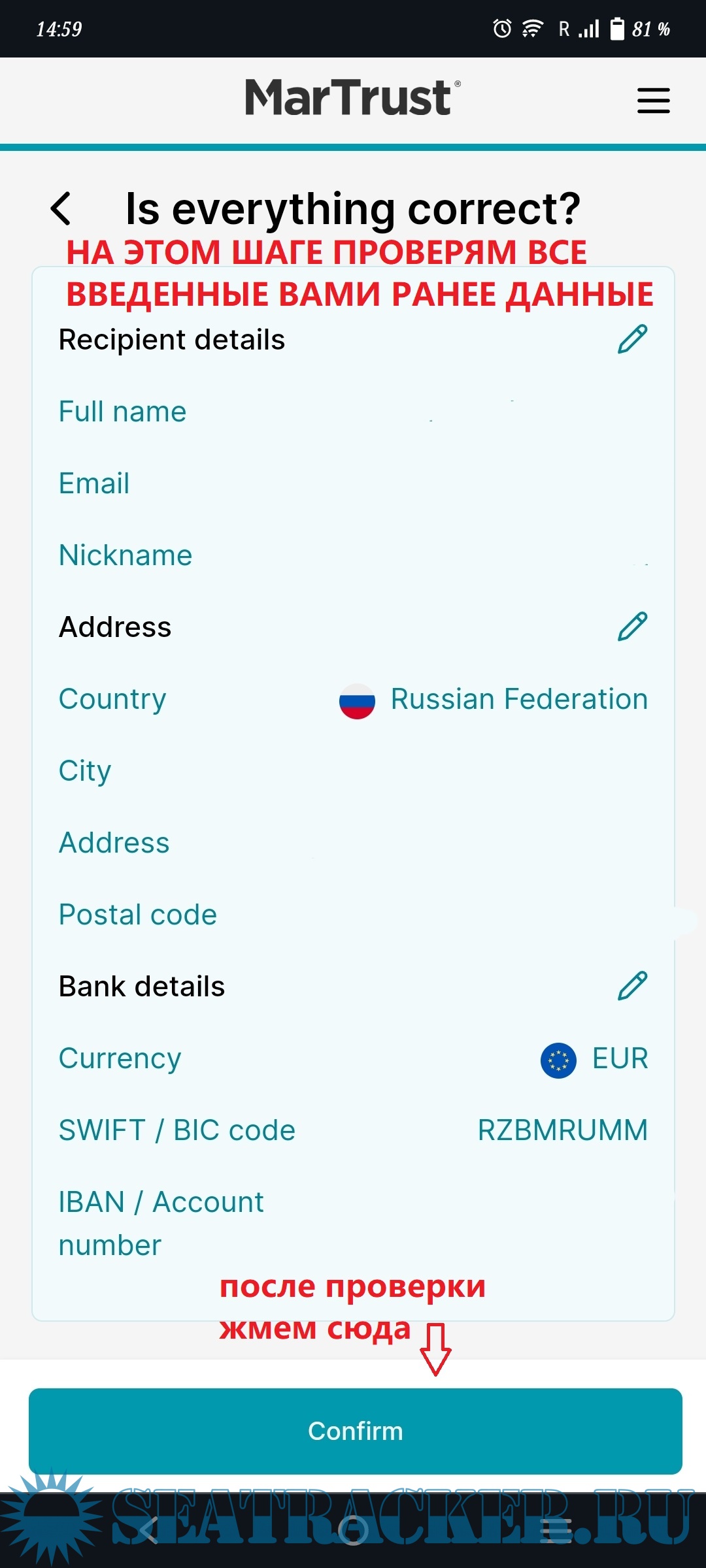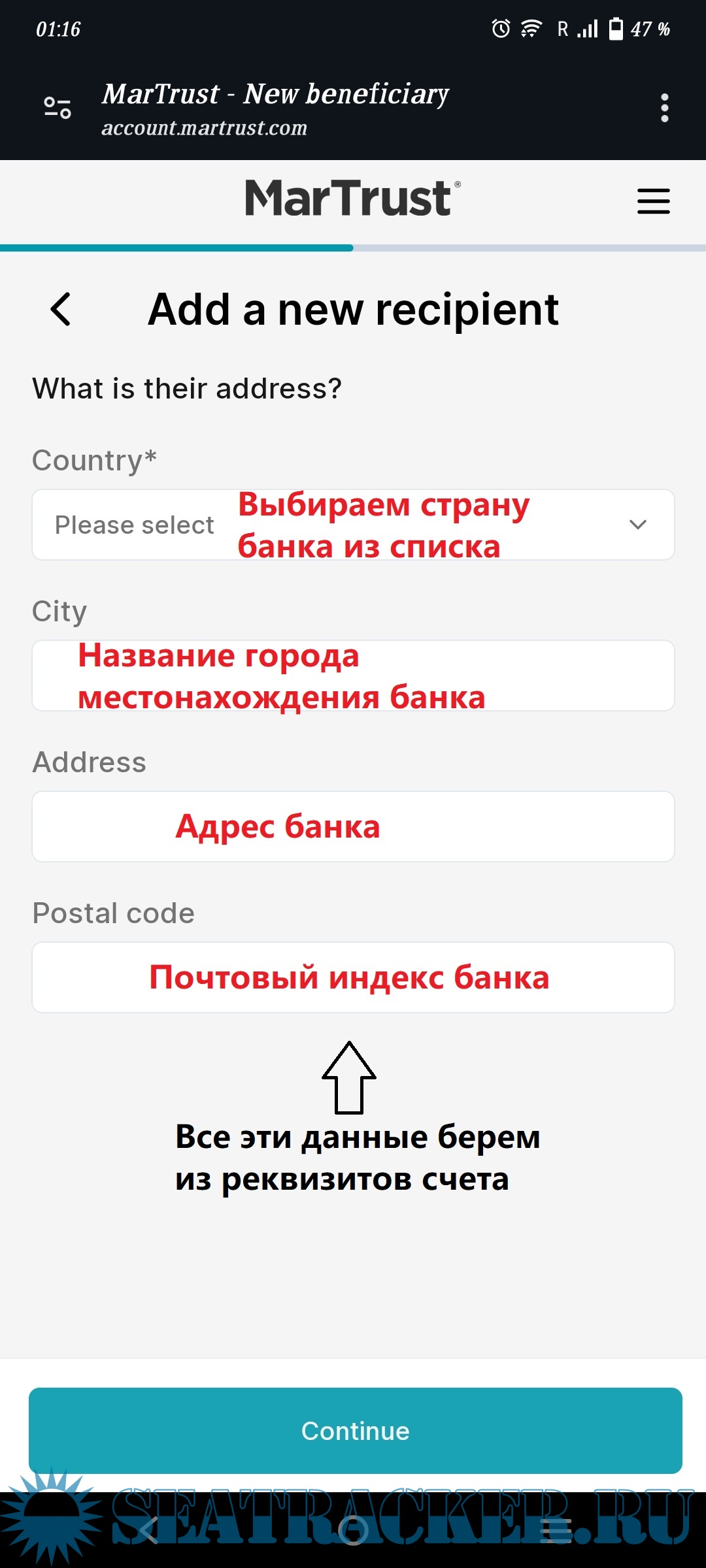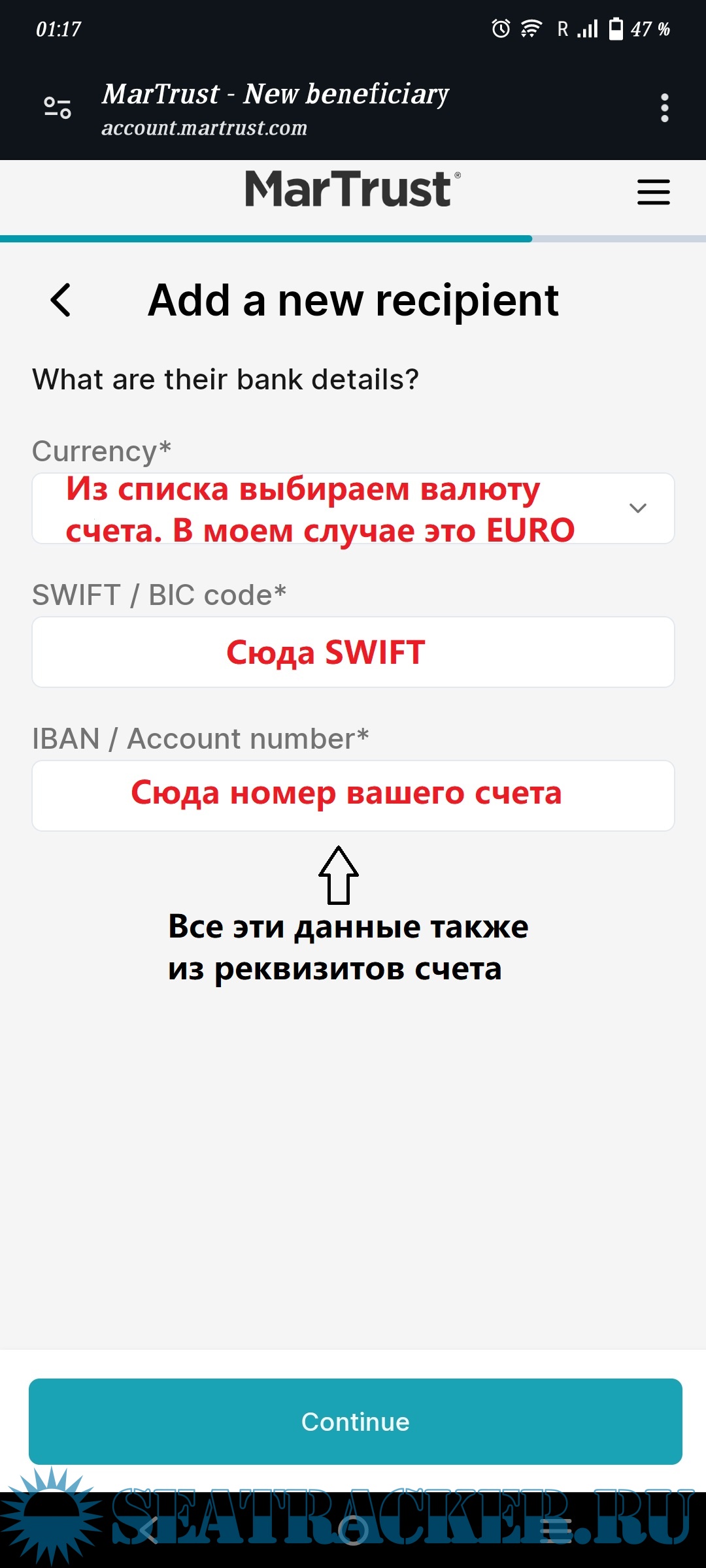 юрец, Добрый день. Подскажите пожалуйста. Пытаюсь перевести через MarTrust в Тинькофф банк по вашей инструкции, в графе BIC/SWIFT ввожу 9-значный код из своих реквизитов о карте состоящий из цифр примерно такого образца: 04XXXXXX4, MarTrust выдаёт что этот BIC код недействителен. This is not a valid value. Подскажите как быть. Тут 31 страница треда, каждое сообщение не смогу даже прочитать, быть может кто-то уже сталкивался тут с подобным, может в Тинькофф уже нельзя переводить, если так, что тогда посоветуете? Быть может у меня не та карта открыта, потому что открывал я счёт как внутренний рублёвый, может мне стоит обратиться в поддержку одного из банков? Спасибо заранее за совет!