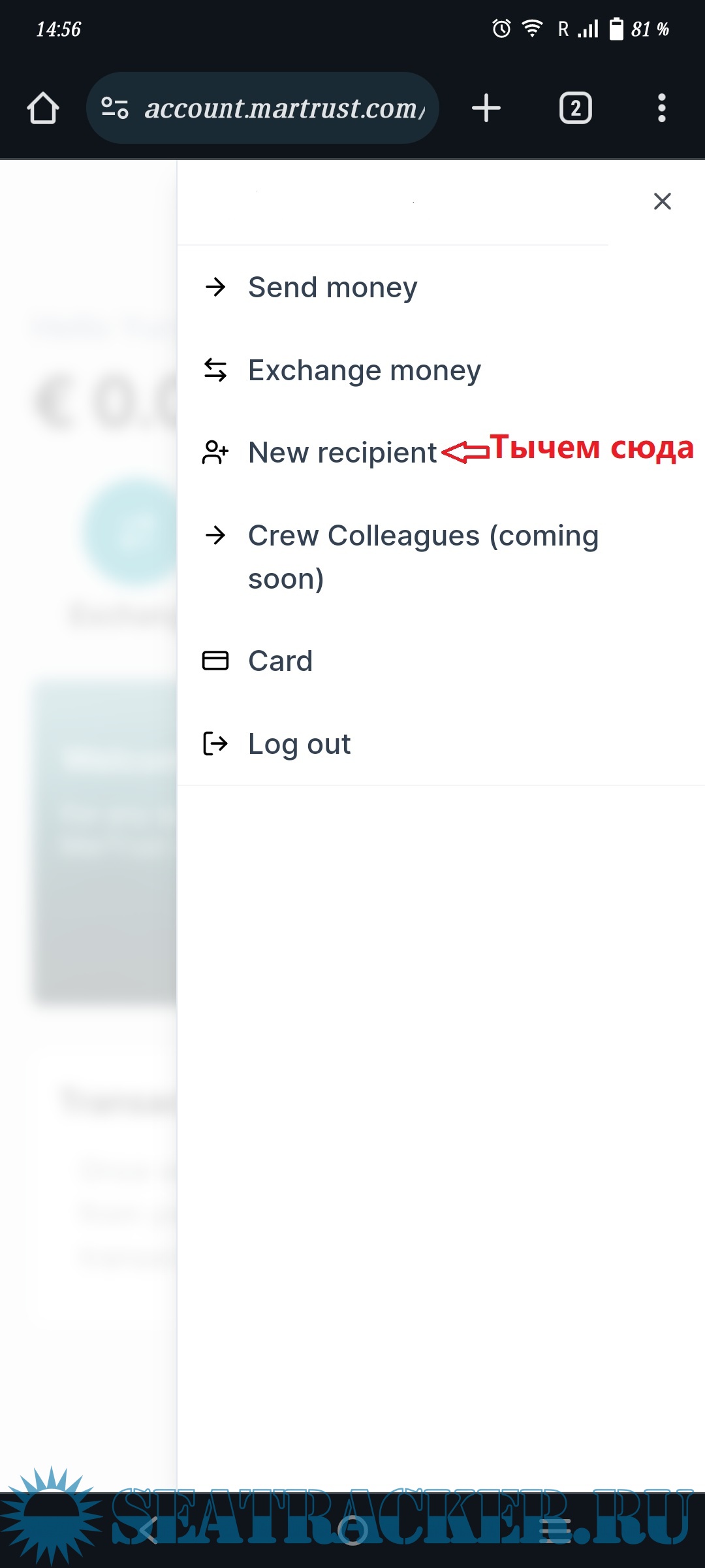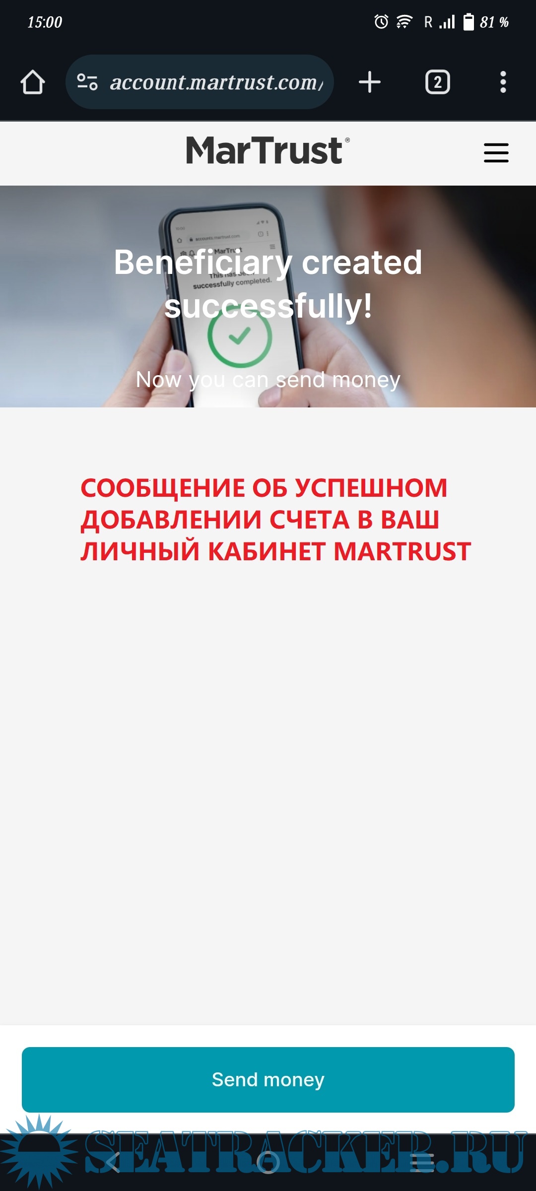 Я с Крыма переводы на Рафшайзер не проходят Отправлял крюинг, а не я сам. После как деньги вернул открыл счет Киргизии и перевел их туда через MarTrast App деньги пришли.