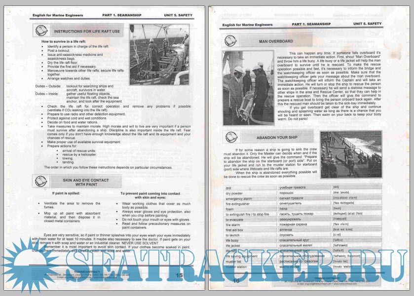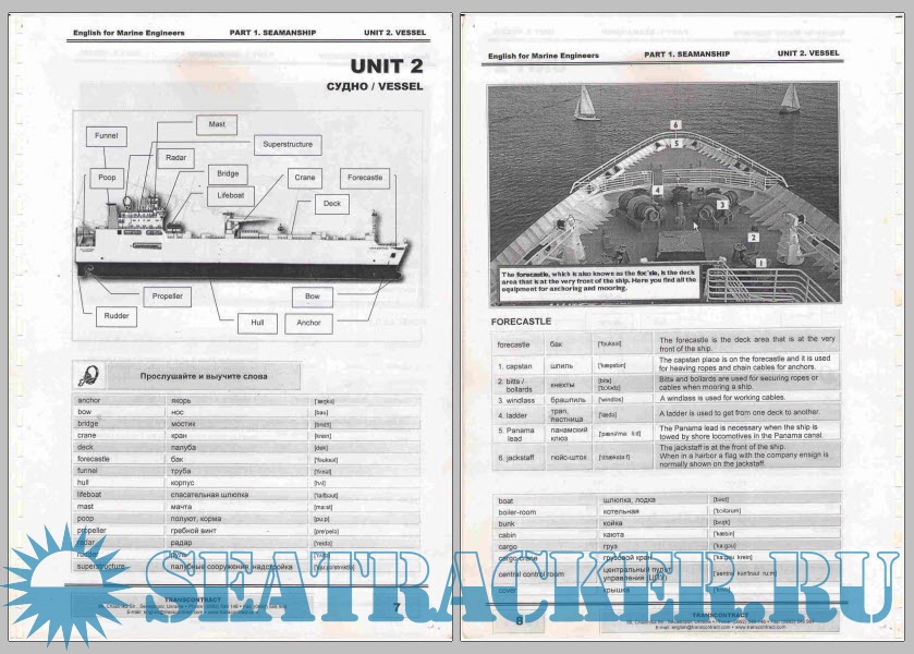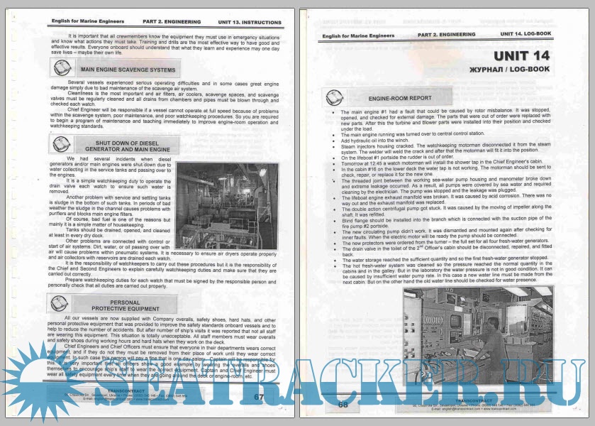 Год выпуска: 2009 Язык: Русский, Английский Автор: Transcontract Жанр: Учебное пособие Издательство: Transcontract Издание: - ISBN: - Формат: PDF Качество: Отсканированные страницы Количество страниц: 196 Описание: Данное учебно-методическое пособие адресовано всем желающим овладеть английским языком и пополнить свои знания в области судомеханики на интенсивных курсах в «Украинской Крюинговой Компании «Трансконтракт». Здесь собраны специальные термины и наиболее употребительная лексика английского языка, необходимые для работы на контракте в англоязычном экипаже. Пособие включает три раздела: В первом разделе даются общие сведения об устройстве судна, экипаже, типах судов, правилах безопасности Приводится список наиболее распространенных вежливых фраз и вопросов на собеседованиях в морских агентствах, а также выражений, которые помогут Вам при посещении аэропорта и врача. Во втором разделе рассматриваются двух- и четырехтактные двигатели, системы дизельного двигателя со схемами, вспомогательные механизмы, неисправности, стандартные рабочие операции, а также требования международных конвенций. Третий раздел посвящен грамматике. Он содержит справочные материалы по фонетике и грамматике с упражнениями и текстами для практического закрепления материала. В приложениях Вы найдете перечень часто употребляемых глаголов английского языка и технический англо-русский и русско-английский словарь. В состав учебных материалов входит аудио- и видеокурс, разработанный с участием носителей языка Благодарим за помощь в проекте Graham Momsey (Великобритания). John Travis (США). Nathan Laye (США), Roger Anderson (Австралия).