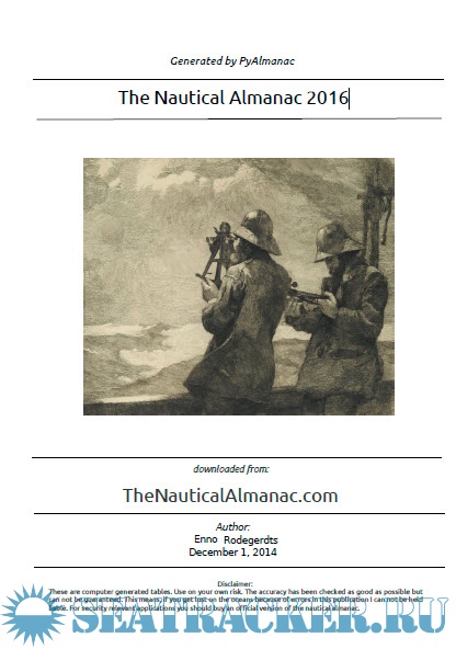 Year: 2016 Language: english Author: Enno Rodegerdts Genre: - Publisher: PyAlmanac Format: PDF Quality: eBook Pages count: 247 Description: These are computer generated tables. Use on your own risk. The accuracy has been checked as good as possible but can not be guaranteed. This means, if you get lost on the oceans because of errors in this publication I can not be held liable. For security relevant applications you should buy an official version of the nautical almanac.