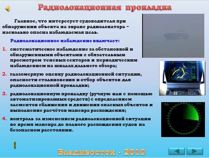 Радиолокационная Прокладка Год выпуска: 2012 Совместимость с Windows7: полная Системные требования: наличие установленного офисного пакета MS Office 2007-2010. (MS PowerPoint ) Язык интерфейса: только русский Таблэтка: Не требуется Описание: Интерактивный курс лекций по работе с планшетами и радиолокационной прокладкой (сопровождается аудио комментариями автора). Доп. информация: Для начала работы запустить файл: Планшет