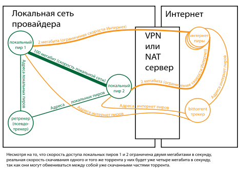 Если вы хотите добавить retracker.local, а также несколько публичных торрент-анонсеров в скачиваемый торрент файл, то отметьте соответствующую галочку в вашем профиле установив чекбокс в положение НЕТ. Отдача будет происходить не только через наш трекер, но и по DHT. Всё что отдается по DHT трекер не учитывает, а значит возможны расхождения в статистике отдано / скачано.-Что такое ретрекер?-Ретрекер - это технология, позволяющая оптимизировать обмен трафиком в удаленных или изолированных сетях. Ретрекер даёт пользователям локальных сетей устанавливать соединения между приватными IP адресами внутри своей сети. Скорость скачивания с Морского трекера для пользователей этих трекеров теперь может превышать скорость их тарифных планов и, в отдельных случаях, доходить до максимальной локальной скорости!-Что даёт использование ретрекера?-Данные, которые вы скачиваете находятся на компьютерах, удалённых от вашего компьютера на разном расстоянии, при скачивании с более ближнего (местная компьютерная сеть) скорость скачивания намного выше. Использование ретрекера позволяет найти и подключиться к наиболее ближнему к Вам компьютеру (компьютерной сети), что позволяет скачивать данные на скоростях приближенных к максимальной. Ретрекер позволяет установить прямое соединение по протоколу битторрент между вашим компьютером и компьютерами абонентов вашего провайдера (или нескольких провайдеров, имеющих соглашение об обмене локальным трафиком)-Что такое "Локальный трафик"?-Локальный трафик - это скачиваемые (отправляемые) данные, обмен которыми происходит между локально объединёнными компьютерами. Такие объединения создаются в местных компьютерных сетях (сетях одного интернет-провайдера) или сетях провайдеров Вашего города (области). Скорости обмена данными в таких сетях намного выше скоростей внешних компьютерных сетей, и у некоторых интернет-провайдеров такой трафик тарифицируется по льготным расценкам, а то и вовсе бесплатен.-Схемы обмена трафиком для сравнения--Подробнее о retracker.local-Ретрекер (retracker) — технология оптимизации обмена битторрент (bittorrent) трафиком внутри локальных сетей. Ретрекер позволяет установить прямое соединение по протоколу битторрент между абонентами одного оператора (или нескольких операторов, имеющих соглашение об обмене локальным трафиком), каждый из которых использует внутренний (локальный) IP-адрес. Технически ретрекер представляет собой простейший bittorrent трекер, как правило, анонимный, работающий внутри адресного пространства локальной сети интернет-провайдера. Использование ретрекера позволяет пирам обмениваться трафиком на повышенной скорости, используя внутреннюю адресацию локальной сети провайдера, так как доступ к локальной сети у многих российских интернет-провайдеров разрешён на более высокой скорости, нежели доступ в интернет. Кроме того, использование ретрекера снижает нагрузку на магистральные каналы связи за счет того, что абонентам не нужно скачивать по отдельности одни и те же данные.-Поддержка ретрекеров через адрес retracker.local-Оригинальная реализация идеи ретрекера была опубликована 10 марта 2009. Смысл её сводится к тому, чтобы либо на стороне трекеров, либо на стороне битторрент-клиентов автоматически добавлять во все торренты адрес вида http://retracker.local/. Таким образом, каждый провайдер ч