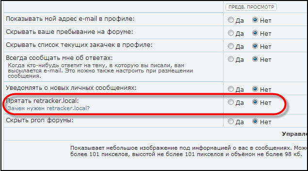 Как включить retracker.local на нашем трекере?-Для этого зайдите в настройки вашего профиля и установите переключатель на "Нет" как показано на рисунке.