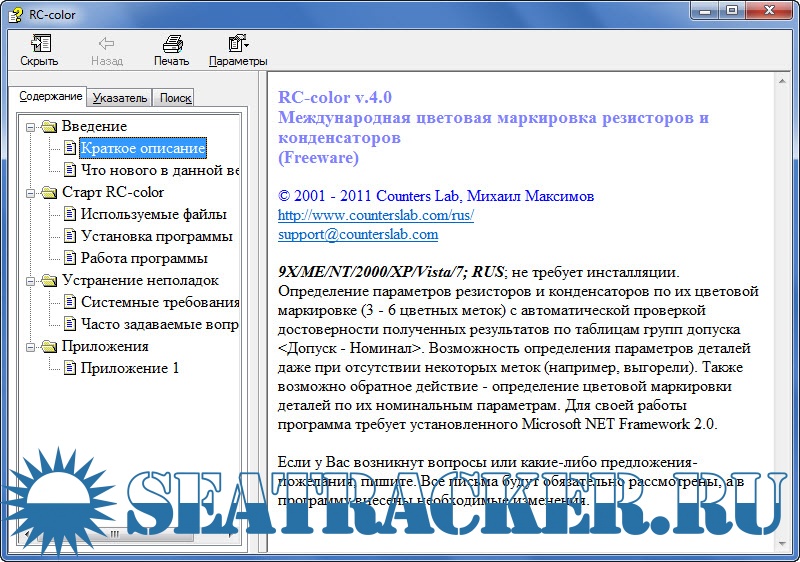 Год выпуска: 2011 Версия: 4.0 Разработчик: Mikhail Maksimov, Counters Lab Платформа: PC (Windows) Совместимость с Windows7: полная Системные требования: 9X/ME/NT/2000/XP/Vista/7; RUS; Freeware; не требует инсталляции. Требуется .NET Framework 2.0 Язык интерфейса: только русский Таблэтка: Не требуется Описание: RC-color - программа, позволяющая определять номинал резистора или конденсатора по цветовой маркировке, нанесенной на его корпус. Чтобы определить номинал радиодетали, пользователю достаточно выбрать её тип и указать номера и цвета меток. После этого приложение выводит данные по конденсатору или резистору (с проверкой по таблицам допуска). Возможна и обратная операция - определение маркировки радиодетали по номиналу. Поддерживается режим работы, когда известны не все цветные метки. Программа не требует инсталляции. Окно с приложением может выводится поверх остальных открытых окон. Новое в v.4.0 ============= - Код программы полностью переписан при помощи Microsoft Visual Studio 8 (был - Microsoft Visual Studio 6). - Добавлено несколько новых типов деталей, сейчас их 10 (было 4). - Добавлена стандартная Справка. Краткое описание программы =========================== Определение параметров резисторов и конденсаторов по их цветовой маркировке (3 - 6 цветных меток) с автоматической проверкой достоверности полученных результатов по таблицам групп допуска <Допуск - Номинал>. Возможность определения параметров деталей даже при отсутствии некоторых меток (например, выгорели). Также возможно обратное действие - определение цветовой маркировки деталей по их номинальным параметрам. Для своей работы программа требует установленного Microsoft NET Framework 2.0. Установка программы =================== Инсталляция, как таковая, не требуется, достаточно просто извлечь из файла архива rc-color.zip папку RC-color и поместить её в любое место Вашего винчестера. Рекомендуется в Program Files. При необходимости создайте ярлык программы на Рабочем столе.