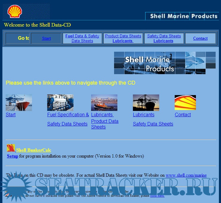 Description: The present software developed by Shell Company is a very handy electronic shell marine products catalogue; it consists of six major parts dedicated to start fuel specification and lubricants, safety data sheets, lubricants, contact, product data sheets, and Shell BunkerCalc program. It will be of some use for people dealing with purchase of marine products. Good mostly for training purposes. However, can also be used for better familiarization with the nomenclature of the fuel oils and lubricants that are in use in marine industry. Apart from the software, the pack of files presented to your attention, includes numerous files providing information on the properties of various fuel oils, such as blended and distillate MDF. The other files provide advice on storage and handling of the lubricants, siting the store, stacking barrels, bulk storage etc. Specifications for various marine fuel oils produced by Shell are also there, together with the table comparing those fuels to British and ISO 8217 standards. In addition, the pack includes a very good fuel specification guide to all Shell marine products, and safety data sheets for all lubricating oil and fuel oil products