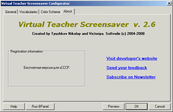 Также в папку с программой включены установочные файлы Speech Engine SDK5.1. Этот пакет предназначен для воспроизведения слов с помощью голоса одного из дикторов.-Описание: Virtual Teacher Background Panel is a free program that will teach you a foreign language when you're working with your computer. A small toolbar on the screen will show you a foreign word and its translation, and you'll just glance at it now and then and memorize new words. You can customize background and text color and the duration of displaying words. And what's more important, it's very easy to mark words you have already learned. Do not waste your time anymore!-Доп. информация: Дополнительные словарики вы можете скачать с оф. сайта разработчиков http://vteacher.net/vocabularies.php-