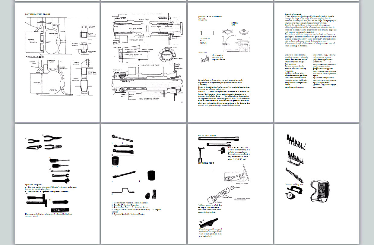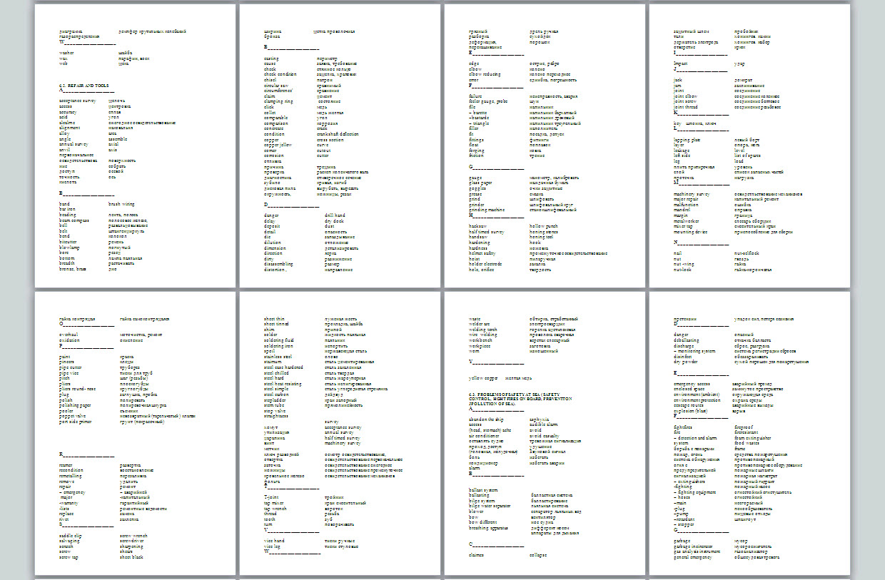 РУССКО-АНГЛИЙСКИЙ СЛОВАРЬ ДЛЯ СУДОМЕХАНИКААвтор: неизвестен Язык: русский Жанр: Словарь Формат: DOC Качество: OCR без ошибок Количество страниц: 140 Описание: РУССКО-АНГЛИЙСКИЙ СЛОВАРЬ 1. БАЗОВЫЙ СЛОВАРЬ включающий термины мини-словаря общеупотребительных слов, по дизельньйм двигателям, ремонту и инструментам, и обеспечению безопасности судна. 2. МИНИ-СЛОВАРЬ 2.1. СУЩЕСТВИТЕЛЬНЫЕ 2.2 Глаголы. 2.3. ПРИЛАГАТЕЛЬНЫЕ И НАРЕЧИЯ. 2.4. ПОЛЕЗНЫЕ СЛОВА 3. СЛОВАРЬ ПРОФЕССИОНАЛЬНЫХ ТЕРМИНОВ 3.1. ДИЗЕЛЬНЫЕ ДВИГАТЕЛИ 3.2. РЕМОНТ И ИНСТРУМЕНТЫ 3.3. ПРОБЛЕМЫ БЕЗОПАСНОСТИ НА МОРЕ БОРЬБЫ С ПОЖАРОМ, ПРЕДОТВРАШЕНИЯ ЗАГРЯЗНЕНИЯ МОРЯ 4. BASIC DICTIONARY containing terms from mini-vocabulary, terms on diesel engines, repair and tools, safety control. 5. MINI-DICTIONARY 5.1. nouns 5.2. VERBS 5.3. CHARACTERISTICS (ADJECITVES& ADVERBS) 5.4. USEFUL WORDS 6. PROFESSIONAL TERMS DICTIONARY 6.1. DIESEL ENGINES 6.2. REPAIR AND TOOLS 6.3. PROBLEMS OF SAFETY AT SEA ( SAFETY CONTROL, HGHT FIRES ON BOARD, PREVENTION JPOLLUHON OF SEA). 7. DICTIONARY IN PICTURE Fig. 1. Two-stroke slow-speed engine MAN-B&WfamalieMC Pig. 2. Cross section of engine SULZER S20 Fig. 3. Connecting rod design Fig. 4. Combustion camber Fig. 5. View of mink-type piston design Fig.6. View of mink-type piston design Fig 7 Exploded view of K Model cylinder head components (Cummins engine) connecting-rod journals Fig. 8. Crankshaft Fig.15 Spray patterns ofvariousnozzle types Fig. 16. Turbocharging system on 4-stroke engine. Fig. 17. Parts of a small turbocharde. Fig. 13. BBC turbocharger components Pig. 19. Alfa-Laval Alfax self-cleaning separator - bowl components. Fig. 20. Lubricating oil system layout for generating set (sump to sump treatment system) Fig. 21. Jacket cooling water system Pig. 22. Section, bolts and gears Hull framing Floating dock GENERAL ARRANGEMENT API CAST STEEL STERN FRAMES STRENGTH OF MATERIALS SOCET EXTENSIONS UNIVERSAL JOINT