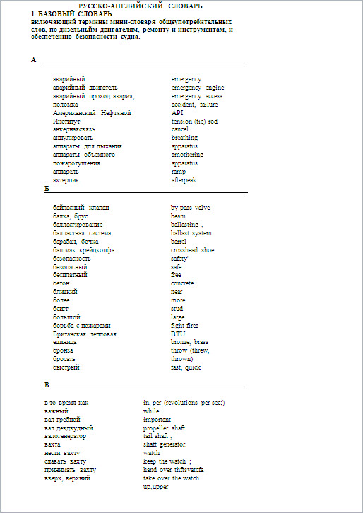 1. БАЗОВЫЙ СЛОВАРЬ включающий термины мини-словаря общеупотребительных слов, по дизельньйм двигателям, ремонту и инструментам, и обеспечению безопасности судна.