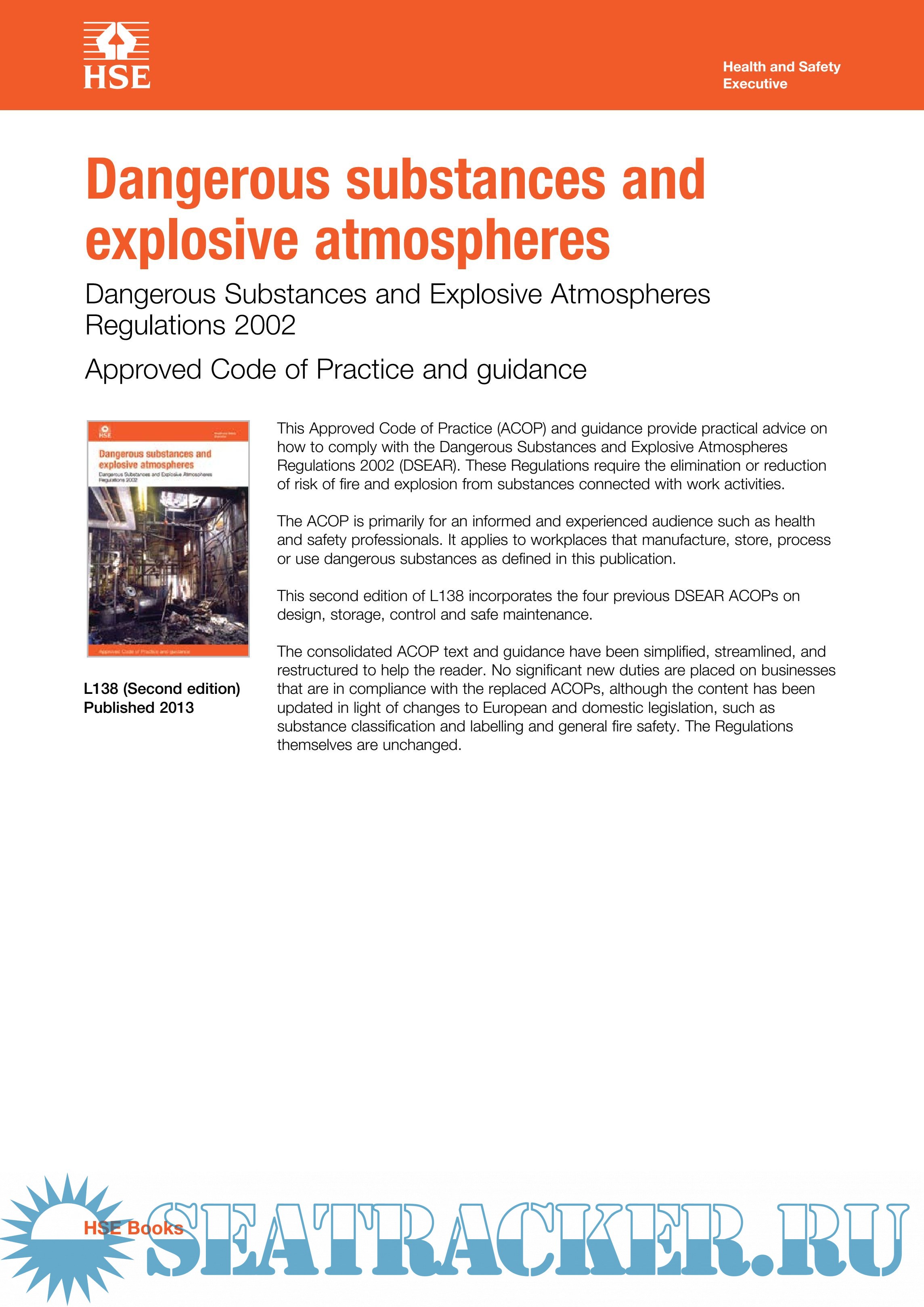 This Approved Code of Practice (ACOP) and guidance provide practical advice on how to comply with the Dangerous Substances and Explosive Atmospheres Regulations 2002 (DSEAR). These Regulations require the elimination or reduction of risk of fire and explosion from substances connected with work activities.