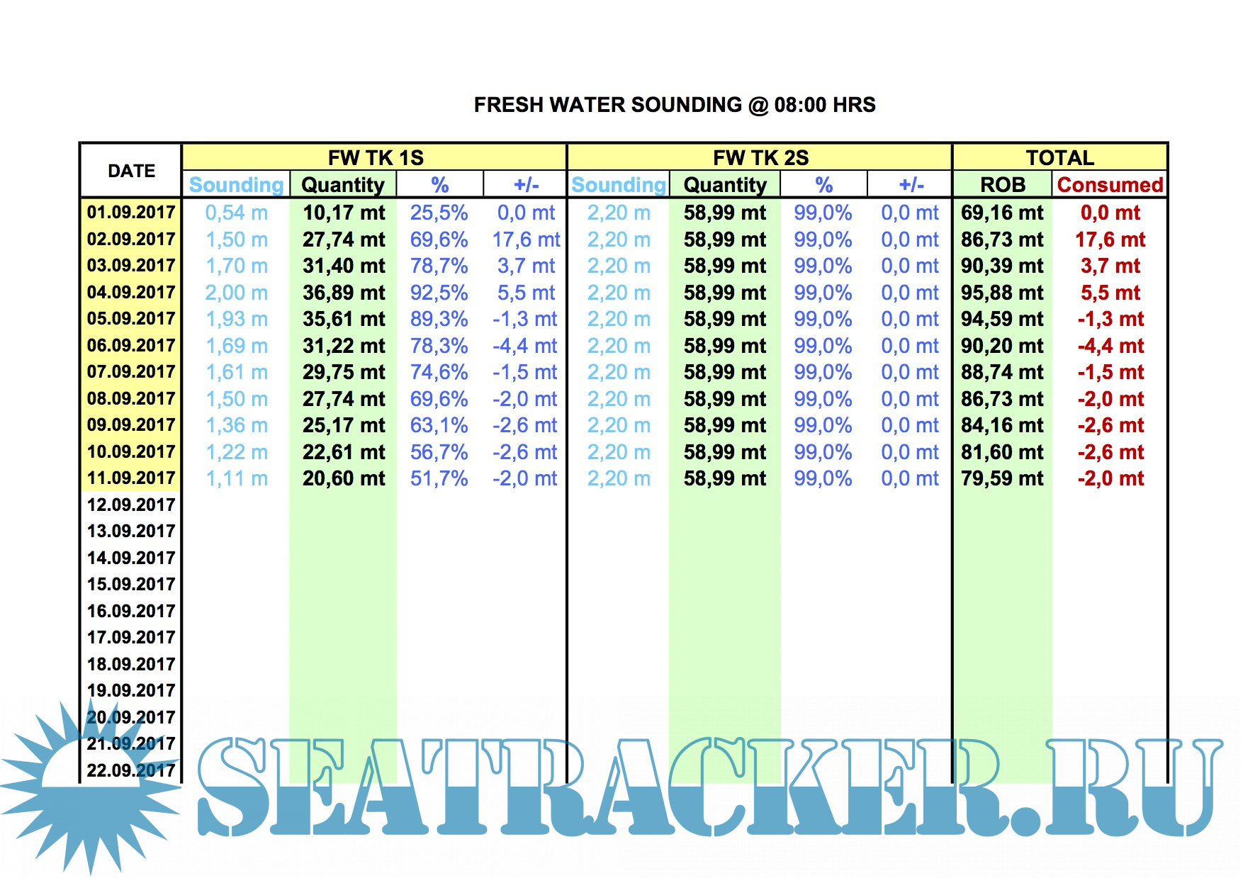 Year: 2017 Version: 1 Developer: Капитан Platform: Windows System Requirements: Microsoft Office Excel любой версии Localization: english Crack: Not needed Description: Расчет замера пресной воды (Fresh Water Sounding) в Excel. 1. Очень проста в использовании. Вводим первую дату (остальные даты добавит в автомате). 2. Вводим замеры танков (программа сделана для расчета двух танков пресной воды) 3. Под свое судно адаптируем, меняя таблицы танков в двух последних вкладках