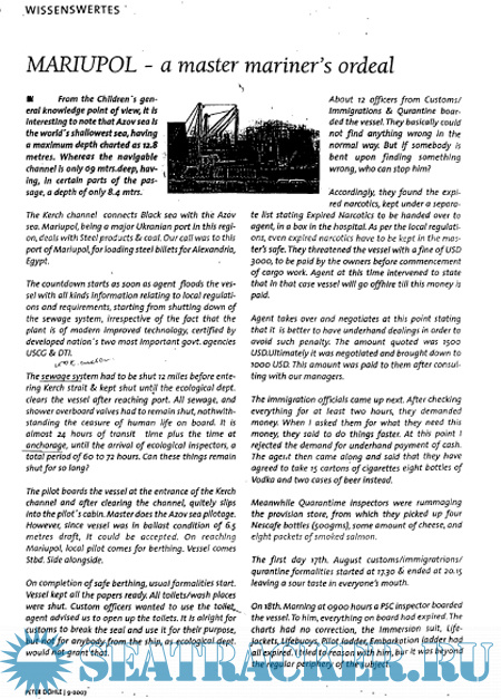 В редакцию была передана ксерокопия статьи, напечатанной в одном из профессиональных изданий за рубежом еще в 2007 году. В ней изложены впечатления капитана немецкого судна о посещении мариупольского порта и о многочисленных поборах, которые берут с иностранных моряков проверяющие службы.