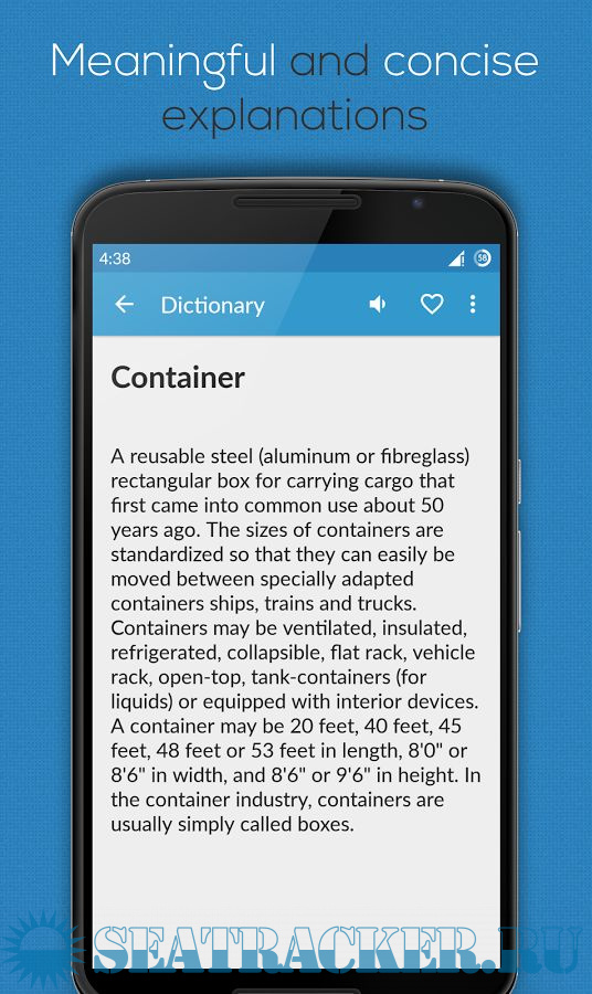 Year: 2015 Version: 2.0 Developer: BLUE WHALE Platform: Android 64-bit OS compatibility: no System Requirements: Android 4.0 or higher Localization: english Crack: Not needed Description: Shipping Dictionary is a handy reference of commonly used terms and acronyms for people involved in international trade or maritime industry - transportation companies, freight forwarders, shipping agents, customs brokers, logistics service providers, stevedoring companies, CFS operators, exporters, importers, chandlers, warehousing companies, ship building and repair firms, professionals in financial and banking institutions, students and hobbyists.