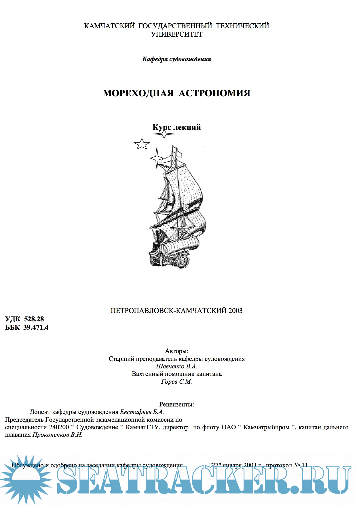 Год выпуска: 2003 Язык: русский Автор: Шевченко В.А., Горев С.М. Жанр: Курс лекций Издательство: КГТУ Формат: PDF Качество: Изначально компьютерное (eBook) Количество страниц: 53 Описание: В курсе лекций изложены основые способы определения места судна в море по небесным светилам и определения поправки ком-пасов астрономическими методами. Раскрыты методы практичес-кой астрономии применительно к задачам судовождения.