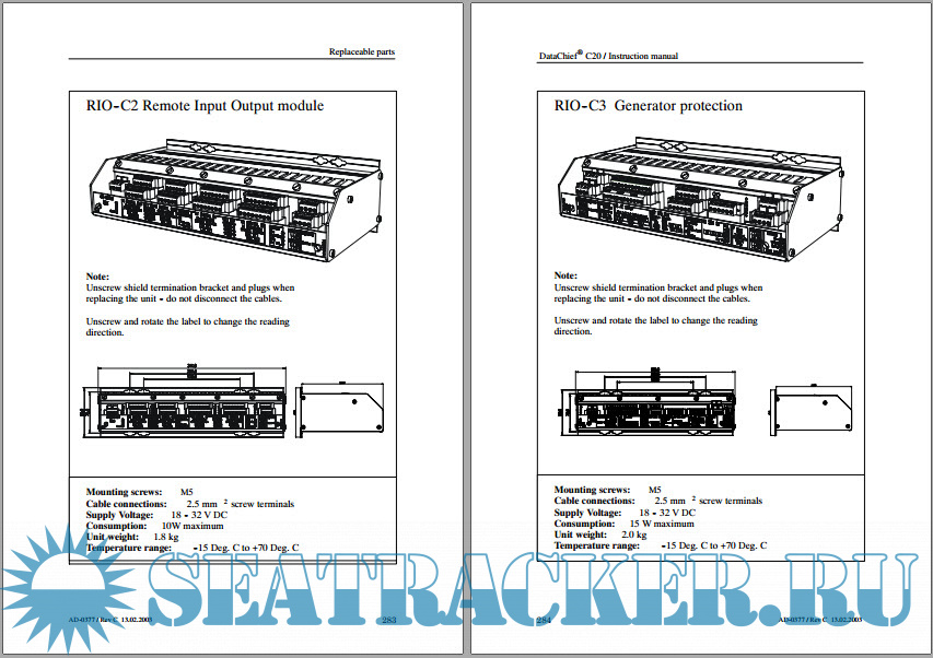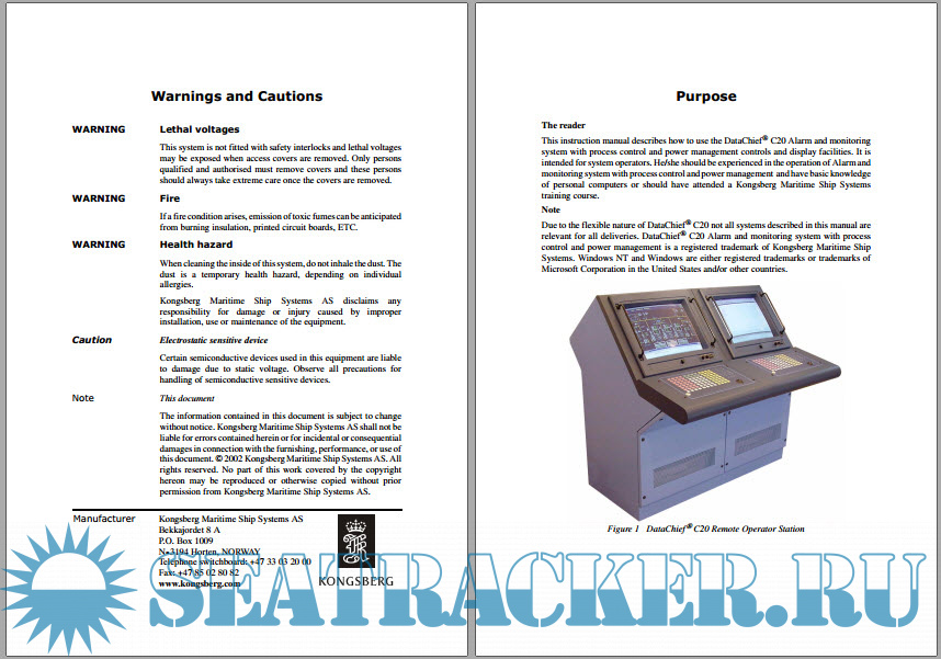 Year: 20** Language: english Author: Kongsberg Genre: Manual Publisher: Kongsberg Format: PDF Quality: eBook Pages count: 317 Description: This instruction manual describes how to use the DataChief C20 Alarm and monitoring system with process control and power management controls and display facilities. It is intended for system operators. He/she should be experienced in the operation of Alarm and monitoring system with process control and power management and have basic knowledge of personal computers or should have attended a Kongsberg Maritime Ship Systems training course. Due to the flexible nature of DataChief C20 not all systems described in this manual are relevant for all deliveries. DataChief C20 Alarm and monitoring system with process control and power management is a registered trademark of Kongsberg Maritime Ship Systems. Windows NT and Windows are either registered trademarks or trademarks of Microsoft Corporation in the United States and/or other countries.
