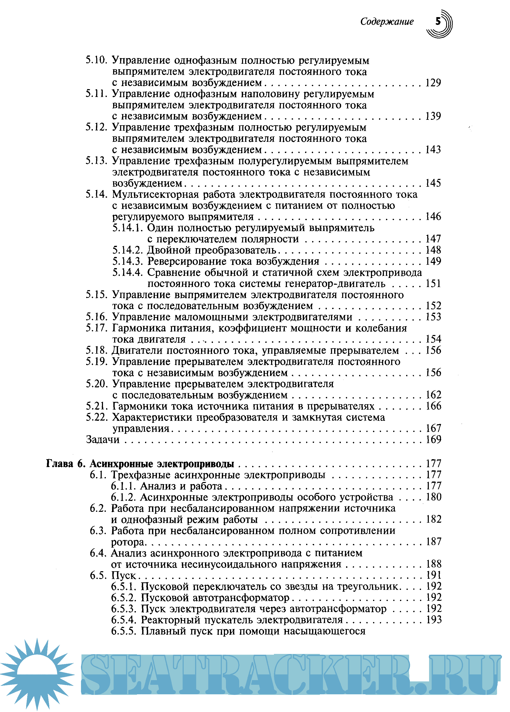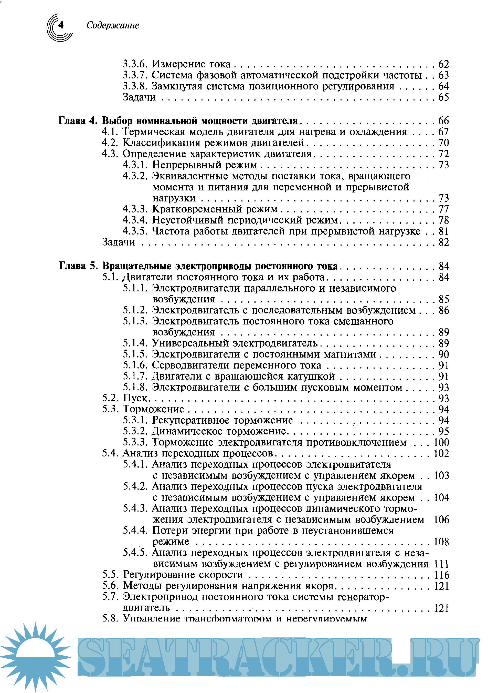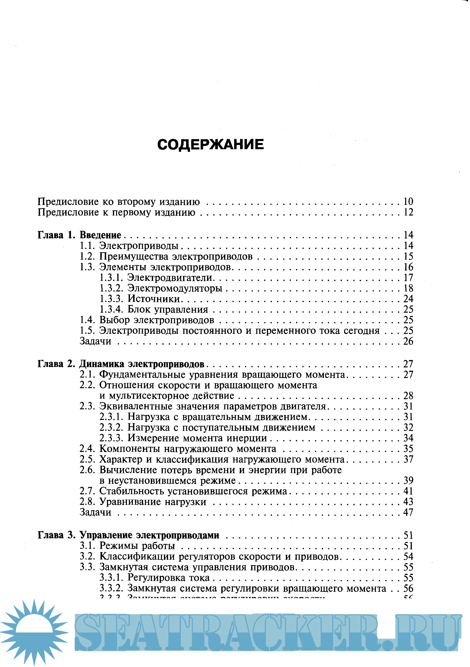 Содержание: Предисловие. Введение. Динамика электроприводов. Управление электроприводами. Выбор номинальной мощности двигателя. Вращательные электроприводы постоянного тока. Асинхронные электроприводы. Шаговые и коммутируемые реактивные электродвигатели. Двигатели на солнечных батареях и аккумуляторах. Тяговые двигатели. Сохранение энергии в электроприводах. Системы электроприводов и их элементы. Задачи (к каждой главе). Литература. Ответы на численные задачи. Предметный указатель.