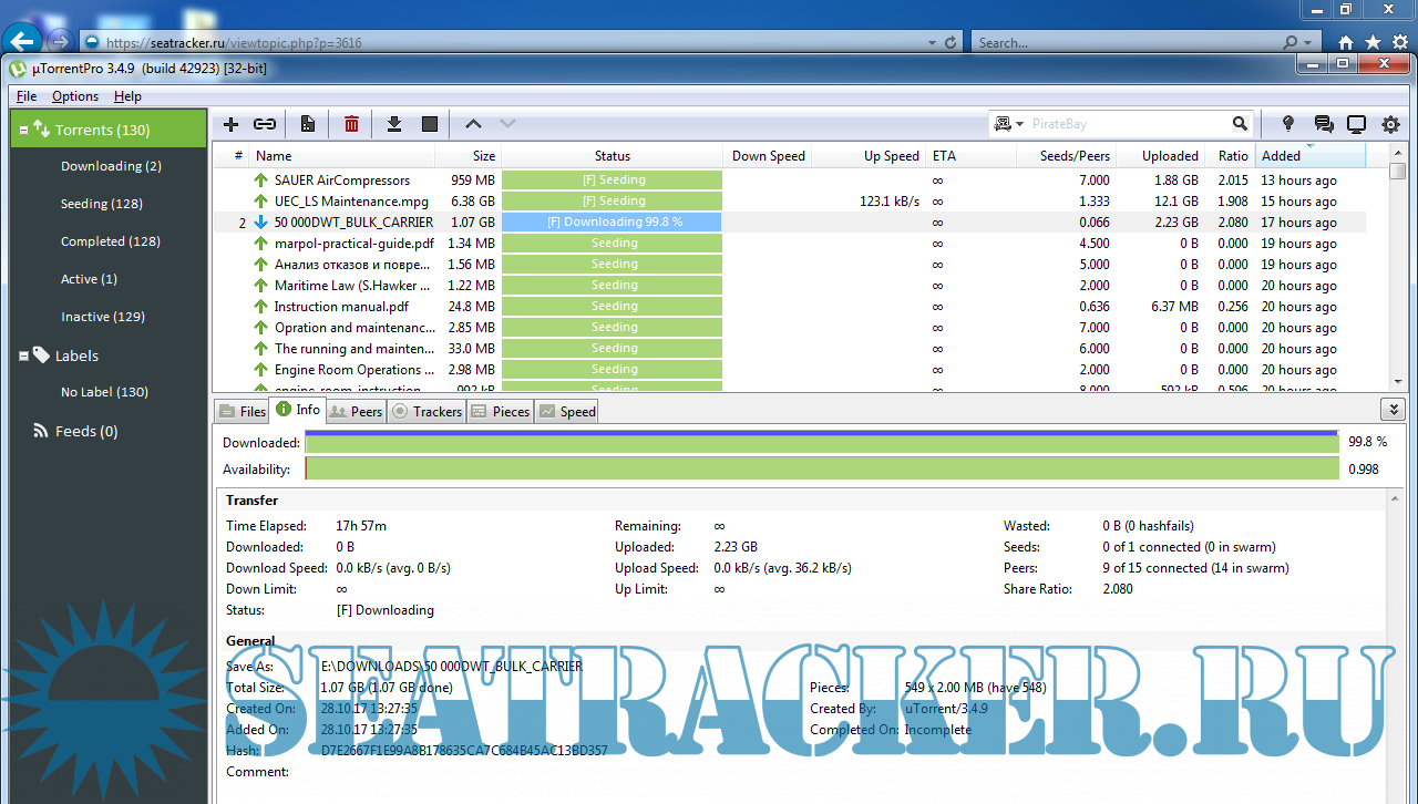 Разобрался. Сам протупил. Итак. Когда создаю торрент в клиенте то имя у него присваивается такого типа "50 000DWT_BULK_CARRIER" по имени папки раздачи. После оформления темы, скачиваю торрент файл с трекера и он уже имеет такое название "50_000DWT_BULK_CARRIER", то есть каждый пробел заменяется "_". Вчера не долго думая вытер первый торрент файл созданный в клиенте и оставил закаченный с трекера. Скрины прилагаю. Т.е. получается раздача ведётся как бы через два торрент файла. Я так понимаю что теперь надо перезаливать по новой. Да, и если надо перезаливать все по новой, то как это правильно сделать?