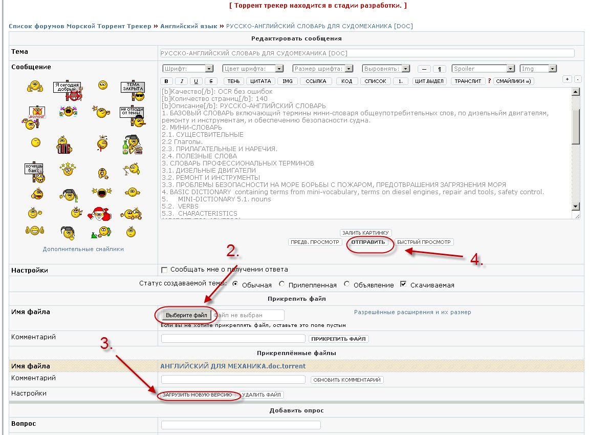 Я поставил статус недооформлено. Теперь вы можете редактировать свою раздачу. Берете изначально созданный программой Utorrent торрент файл и зайдя в редактирование вашей раздачи просто в поле прикрепленные файлы - настройки - нажимаете кнопку загрузить новую версию - после чего указываете путь к вашему торрент файлу. После этого скачиваете с сайта этот же торрент и добавляете его к себе в раздачу в Utorrent. Программа скажет, что торрент уже присутствует и предложить обновить торрент. Соглашаемся. А вот после этого надо всех уведомить здесь, в теме, что вы перезалили торрент и его необходимо всем скачать и поставить снова на закачку.