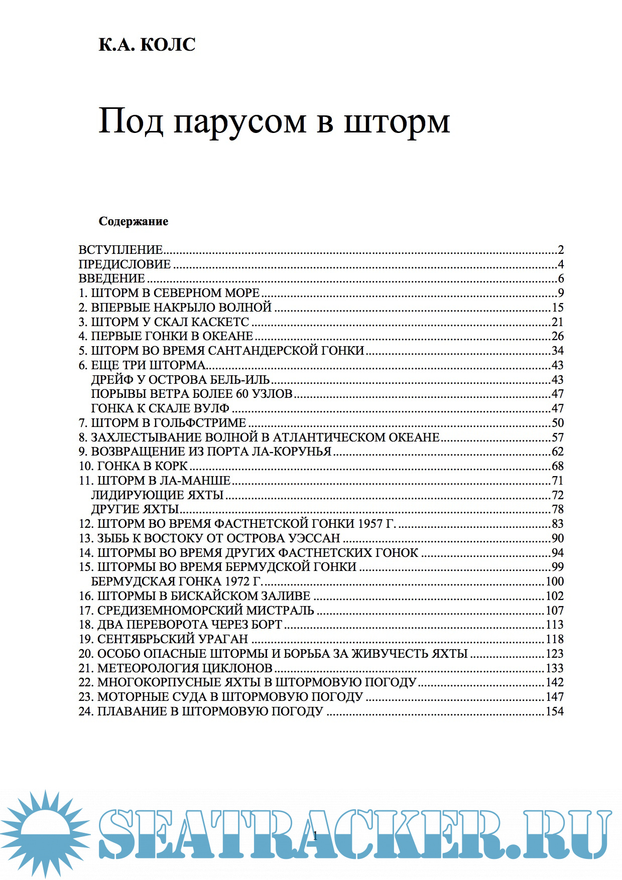 Год выпуска: 1985 Язык: русский Автор: К. Адлард Колс Жанр: Другое Издательство: Гидрометеоиздат Формат: PDF Качество: Распознанный текст без ошибок (OCR) Количество страниц: 172 Описание: В книге рассказывается о длительных походах под парусом и многодневных соревнованиях крейсерско-гоночных яхт, в которых принимал участие сам автор и другие яхтсмены. Из всего многообразия эпизодов, происходящих во время плавания под парусом, отобраны наиболее драматические - борьба яхты с разбушевавшейся стихией ветра и волн. Книга интересна не только яхтсменам и людям, профессионально связанным с морем, - они найдут здесь много полезных сведений об управлении яхтой во время шторма, причинах различных аварий и т. п., - но и широкому кругу читателей, которых привлечет описание штормов по впечатлениям яхтсменов и захватывающие фотографии. Эта книга посвящена плаванию под парусом в плохую погоду. Под плохой погодой я подразумеваю свежий ветер силой 5 баллов по шкале Бофорта, сильный и крепкий ветер силой 6—7 баллов, очень крепкий ветер силой 8 баллов и штормовой ветер силой 9 баллов и более. В каждой главе вначале приводится описание шторма, затем следуют результаты наблюдений и выводы. Глава о метеорологии циклонов написана Аланом Уотсом, метеорологом и яхтсменом. В ней рассматриваются некоторые характерные штормы и причины их возникновения. В приложениях “Теория волн и данные наблюдений” капитана Стюарта и “Ненормальные волны” Л. Дрейпера дается объяснение многих явлений, описанных в книге.