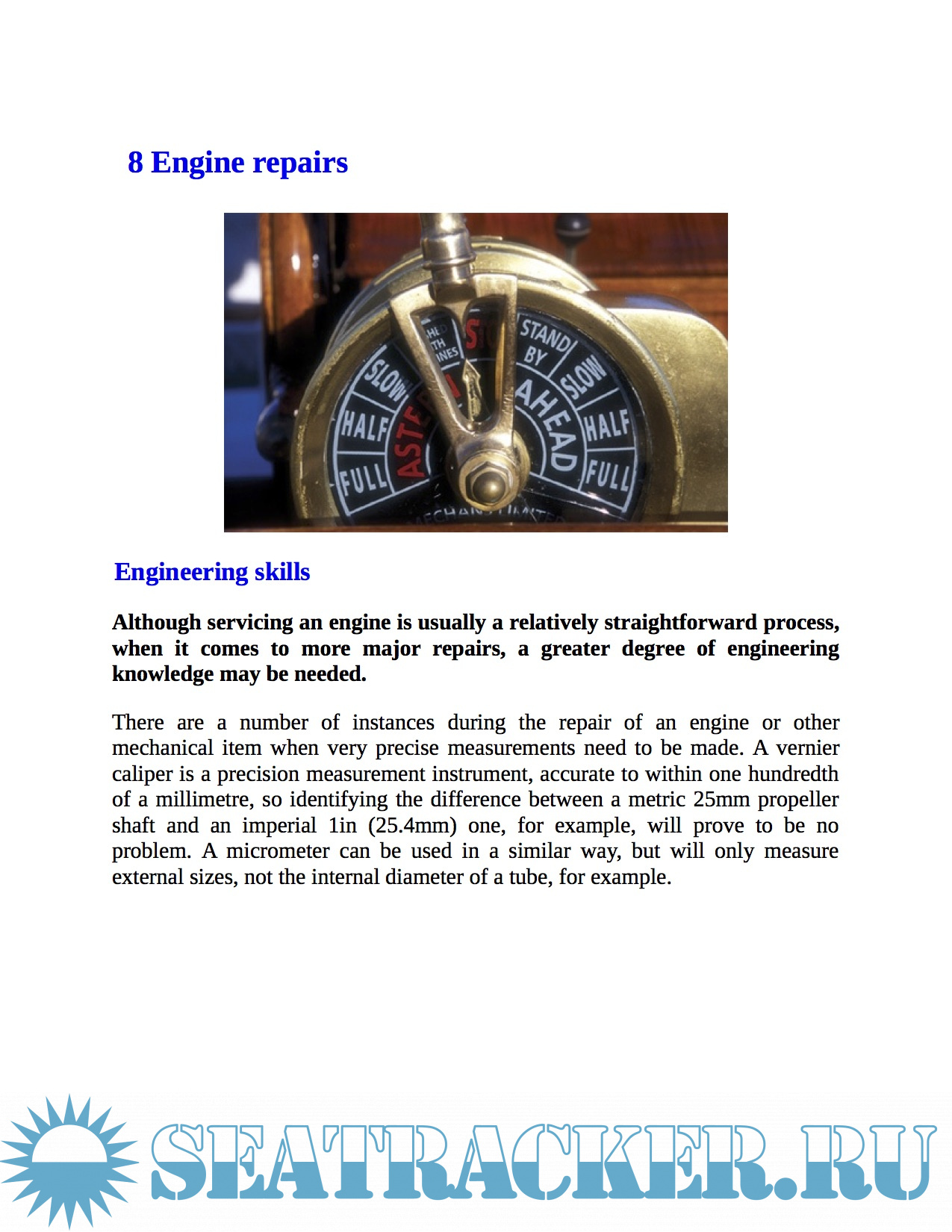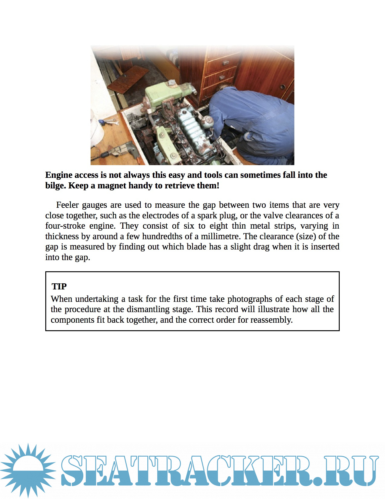 The section on general mechanics shows how to fix problems with a split fuel/water tank and leaking hydraulics, whilst electrical repairs cover tracing loose connections, replacing damaged wiring and fixing navigation instruments. The myriad of issues that can arise with the engine are covered in great detail, from how to deal with water in the fuel system to replacing the propeller and its shaft. And there is even a section on domestic items, such as repairing upholstery, and fixing problematic heads.