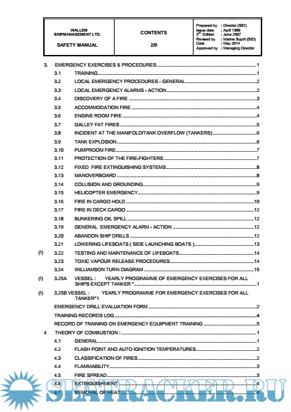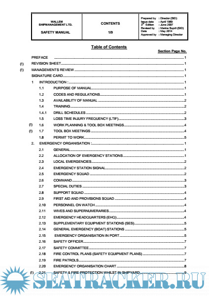PREFACE ......................................................................................................................................1 REVISION SHEET...............................................................................................................................1 MANAGEMENTS REVIEW .................................................................................................................1 SIGNATURE CARD.............................................................................................................................1 1 INTRODUCTION :.......................................................................................................................1 1.1 PURPOSE OF MANUAL....................................................................................................1 1.2 CODES AND REGULATIONS...........................................................................................1 1.3 AVAILABILITY OF MANUAL .............................................................................................2 1.4 TRAINING...........................................................................................................................2 1.4.1 DRILL SCHEDULES ..........................................................................................................2 1.5 LOSS TIME INJURY FREQUENCY (LTIF).......................................................................3 1.6 WORK PLANNING & TOOL BOX MEETINGS.................................................................4 1.7 TOOL BOX MEETINGS.....................................................................................................4 1.8 PERMIT TO WORK............................................................................................................5 2. EMERGENCY ORGANISATION :...............................................................................................1 2.1 GENERAL...........................................................................................................................1 2.2 ALLOCATION OF EMERGENCY STATIONS..................................................................1 2.3 LOCAL EMERGENCIES....................................................................................................2 2.4 EMERGENCY STATION SIGNAL.....................................................................................2 2.5 EMERGENCY SQUAD ......................................................................................................2 2.6 COMMAND.........................................................................................................................3 2.7 SPECIAL DUTIES..............................................................................................................3 2.8 SUPPORT SQUAD ............................................................................................................4 2.9 FIRST AID AND PROVISIONS SQUAD ...........................................................................4 2.10 PERSONNEL ON WATCH ................................................................................................4 2.11 WIVES AND SUPERNUMERARIES.................................................................................4 2.12 EMERGENCY HEADQUARTERS (EHQ).........................................................................4 2.13 SUPPLEMENTARY EQUIPMENT STATIONS (SES)......................................................5 2.14 GENERAL EMERGENCY (BOAT) STATIONS ................................................................5 2.15 EMERGENCY ORGANISATION IN PORT......................................................................5 2.16 SAFETY OFFICER.............................................................................................................7 2.17 SAFETY COMMITTEE.......................................................................................................7 2.18 FIRE CONTROL PLANS (SAFETY EQUIPMENT PLANS) .............................................7 2.19 FIRE PATROLS..................................................................................................................7 2.20 EMERGENCY ORGANISATION CHART.........................................................................8 2.21 SAFETY & FIRE PROTECTION WHILST IN SHIPYARD................................................9 3. EMERGENCY EXERCISES & PROCEDURES..........................................................................1 3.1 TRAINING...........................................................................................................................1 3.2 LOCAL EMERGENCY PROCEDURES - GENERAL.......................................................2 3.3 LOCAL EMERGENCY ALARMS - ACTION......................................................................2 3.4 DISCOVERY OF A FIRE ...................................................................................................3 3.5 ACCOMMODATION FIRE.................................................................................................4 3.6 ENGINE ROOM FIRE........................................................................................................4 3.7 GALLEY FAT FIRES..........................................................................................................5 3.8 INCIDENT AT THE MANIFOLD/TANK OVERFLOW (TANKERS)..................................6 3.9 TANK EXPLOSION............................................................................................................6 3.10 PUMPROOM FIRE.............................................................................................................7 3.11 PROTECTION OF THE FIRE-FIGHTERS........................................................................7 3.12 FIXED FIRE EXTINGUISHING SYSTEMS......................................................................8 3.13 MANOVERBOARD ................................................................................................