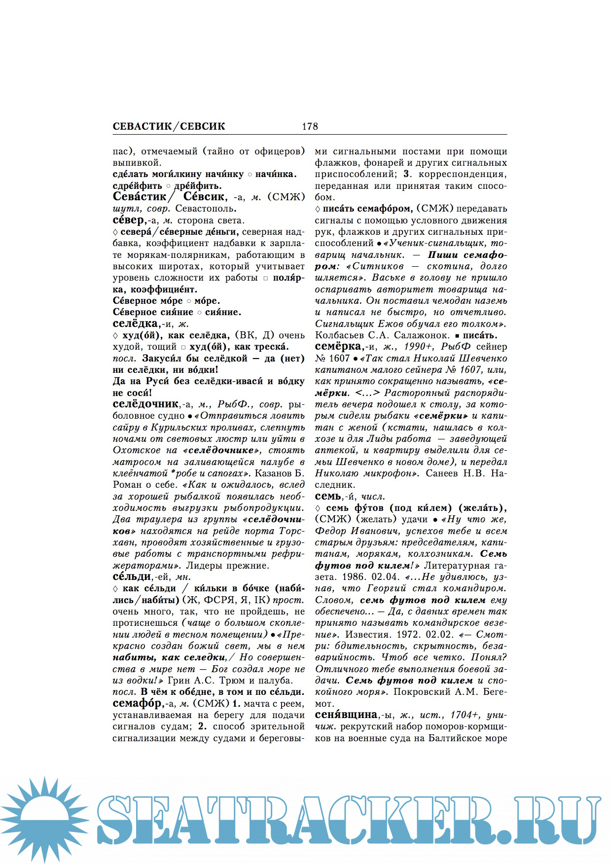 Описание: Словарь включает в себя более 3000 единиц русского морского профессионального некодифицированного языка, который используется моряками и работниками береговых служб в профессиональном общении. В словаре также фиксируются лексические и фразеологические единицы языка, некогда широко употреблявшиеся моряками дореволюционный России и Советского Союза.