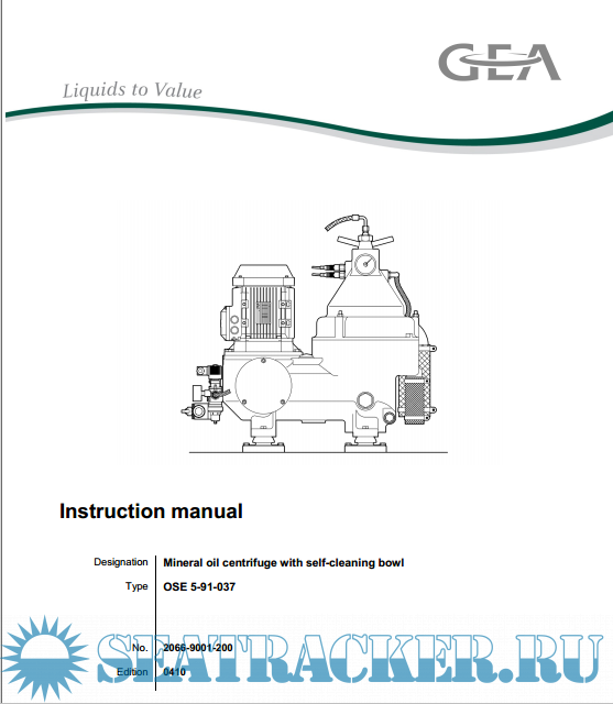 Year: 2014 Language: english Author: GEA Westfalia Genre: Instruction Format: PDF Quality: eBook Number of pages: 210 Description: Centrifugal separators - called separators in short - are used • for the separation of liquid mixtures which consist of two liquids, with simultaneous removal of the solids contained in the liquids. • for removing (clarifying) solids from a liquid. The separator is designed • for a very high bowl speed. The admissible bowl speed depends on the chemical and physical properties of the product: - Temperature - Density of the fluid and solid components. • for products which contain no corrosive and erosive components. The aggressiveness of the product influences the careful selection of the bowl material. Only products conforming to the specifications on the nameplate may be processed. • in accordance with the method of application of the separator agreed with GEA Westfalia Separator. Refer to the data sheet and contractually agreements. • in accordance with the admissible utilities (cleaning agents, lubricants, operating liquids etc.) specified in the documentation or on the data sheet.