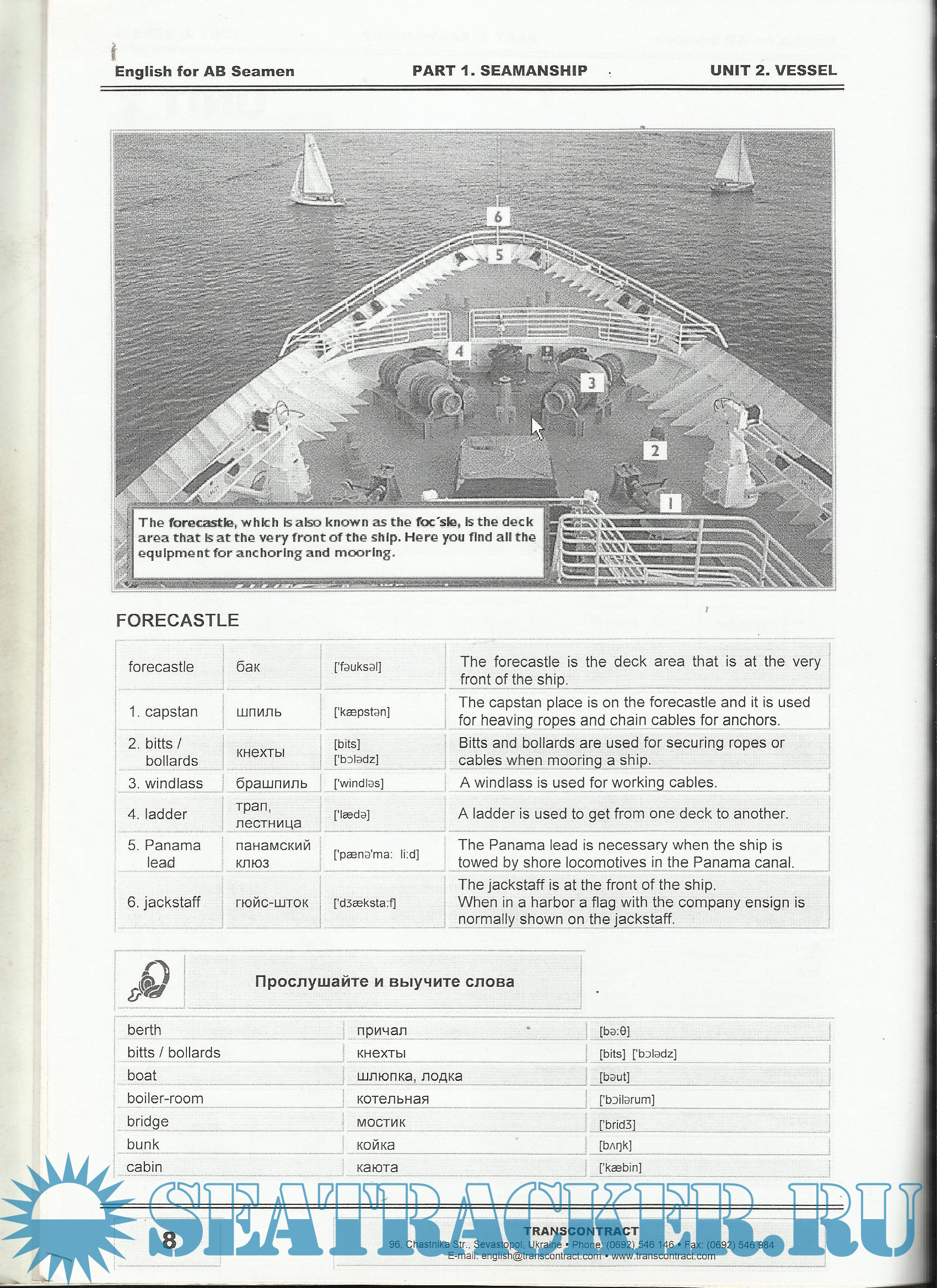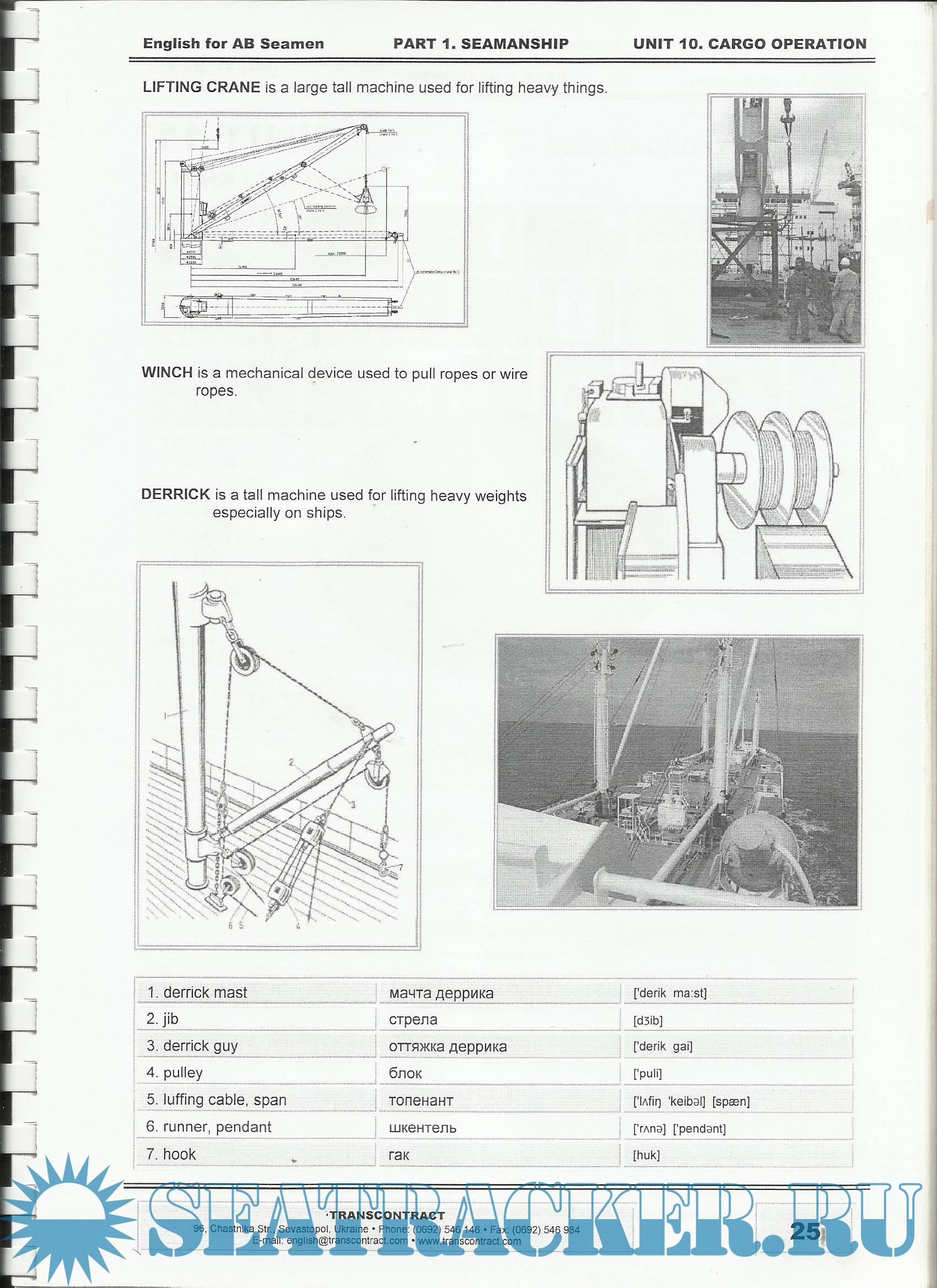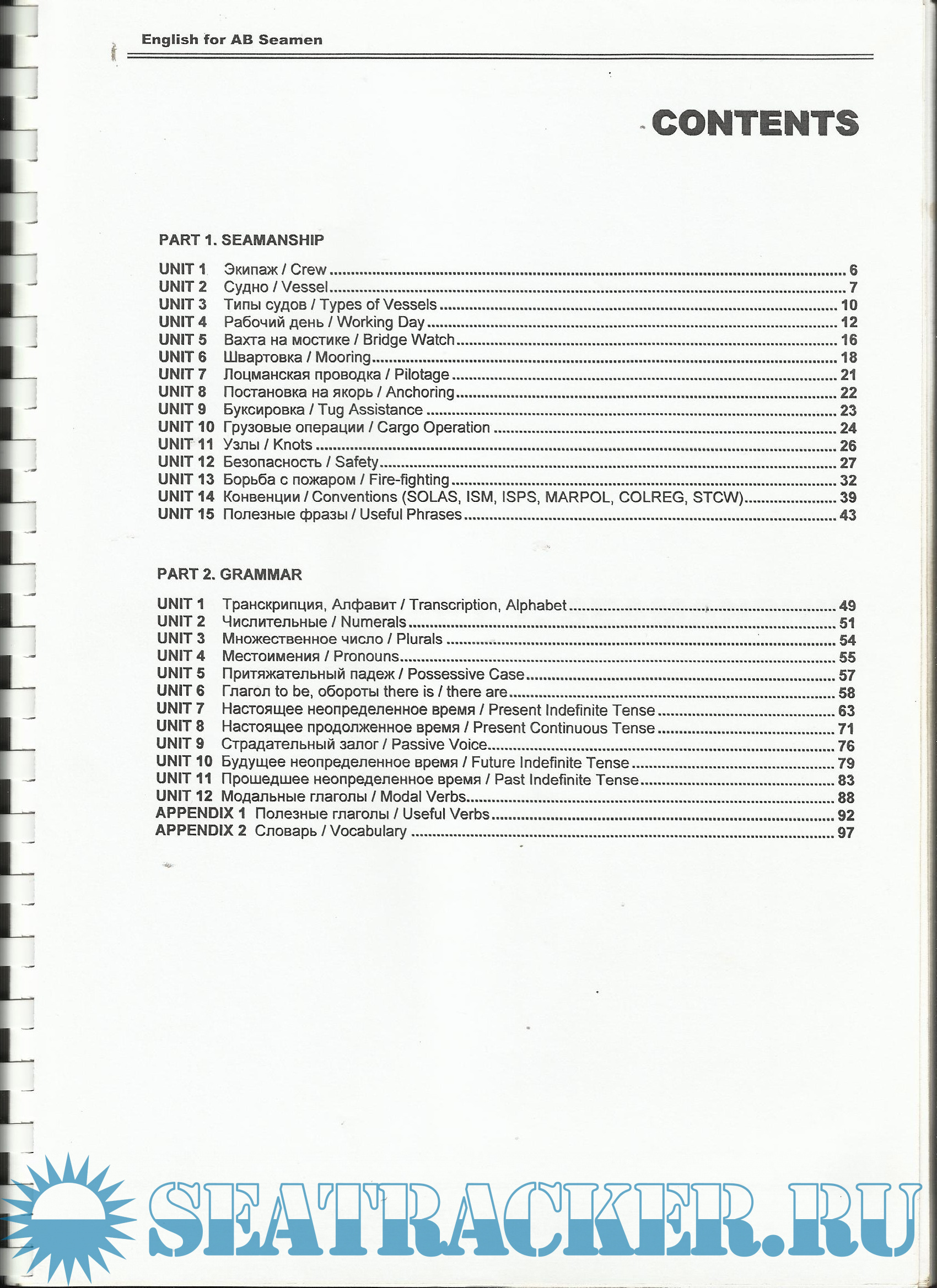 PART 1. SEAMANSHIP. UNIT 1 ЭКИПАЖ / CREW.UNIT 2 СУДНО / VESSEL.UNIT 3 ТИПЫ СУДОВ / TYPES OF VESSELS.UNIT 4 РАБОЧИЙ ДЕНЬ / WORKING DAY.UNIT 5 ГРУЗОВЫЕ УСТРОЙСТВА / CARGO GEARS.UNIT 6 КОМАНДЫ РУЛЕВОМУ / WHEEL ORDERS.UNIT 7 ШВАРТОВКА / MOORING.UNIT 8 УЗЛЫ / KNOTS.UNIT 9 БЕЗОПАСНОСТЬ / SAFETY.UNIT 10 ПОЛЕЗНЫЕ ФРАЗЫ / USEFUL PHRASES.PART 2. GRAMMAR. UNIT 1 ТРАНСКРИПЦИЯ, АЛФАВИТ / TRANSCRIPTION, ALPHABET.UNIT 2 ЧИСЛИТЕЛЬНЫЕ / NUMERALS.UNIT 3 МНОЖ. ЧИСЛО СУЩЕСТВИТЕЛЬНЫХ / PLURALS.UNIT 4 МЕСТОИМЕНИЯ / PRONOUNS.UNIT 5 ПРИТЯЖАТЕЛЬНЫЙ ПАДЕЖ / POSSESSIVE CASE.UNIT 6 ГЛАГОЛ TO BE, ОБОРОТЫ THERE IS/ARE.UNIT 7 НАСТОЯЩЕЕ ВРЕМЯ / PRESENT SIMPLE.UNIT 8 СТРАДАТЕЛЬНЫЙ ЗАЛОГ / PASSIVE VOICE.UNIT 9 НАСТОЯЩЕЕ ПРОДОЛЖЕННОЕ / PRESENT CONTINUOUS.UNIT 10 БУДУЩЕЕ ВРЕМЯ / FUTURE TENSE.UNIT 11 ПРОШЕДШЕЕ ВРЕМЯ / PAST SIMPLE TENSE.UNIT 12 МОДАЛЬНЫЕ ГЛАГОЛЫ / MODAL VERBS.APP. 1 ПОЛЕЗНЫЕ ГЛАГОЛЫ / USEFUL VERBS.