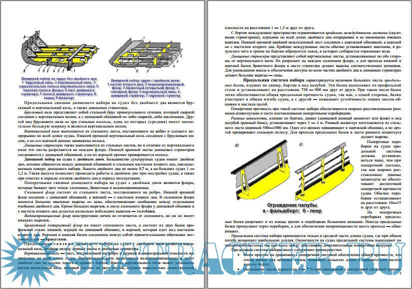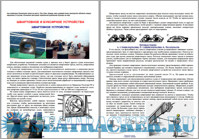 Конструкция корпуса морских судов______________________________ Понятие о прочности н системах набора__________________________ Конструкция судового набора____________________________________ Штевнн н выход трсбных валов___________________________________ Грузовые помещения н балластные цистерны_______________________ Якорное устройство_____________________________________________ Якоря__________________________________________________________ Якорные цепи (канаты)__________________________________________ Использование якорного устройства н уход за ним________________ Правила технической эксплуатации якорного устройства___________ Грузовое устройство____________________________________________ Судовые мачты__________________________________________________ Конструкция грузовой стрелы____________________________________ Способы работы стрелами________________________________________ Уход за грузовым устройством___________________________________ Люковое устройство_____________________________________________ Рулевое устройство Конструкция рулей______________________________________________ Погуливающие устройства________________________________________ Рулевые приводы________________________________________________ Уход за рулевым устройством____________________________________ Спасательные средства__________________________________________ Снабжение судов спасательными средствами_______________________ Типы спасательных шлюпок_______________________________________ Снабжение спасательных шлюпок__________________________________ Спасательные плоты н их снабжение______________________________ Индивидуальные спасательные средства___________________________ Размещение спасательных средств н устройств на судах___________ Спуск н подъем спасательных шлюпок и плотов____________________ ТАКЕЛАЖНОЕ СНАРЯЖЕНИЕ СУДНА Предметы такелажного снаряжения________________________________ Морские узлы___________________________________________________ Такелажные работы______________________________________________ Двадцать четыре морских узла___________________________________ Швартовное и буксирное устройства______________________________ Швартовное устройство__________________________________________ Буксирное устройство