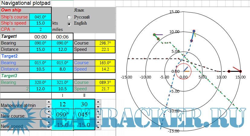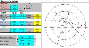 Описание: This small program written in Excel for radar plotting pad simulations. Navigators can play with own vessel and up to 3 targets.