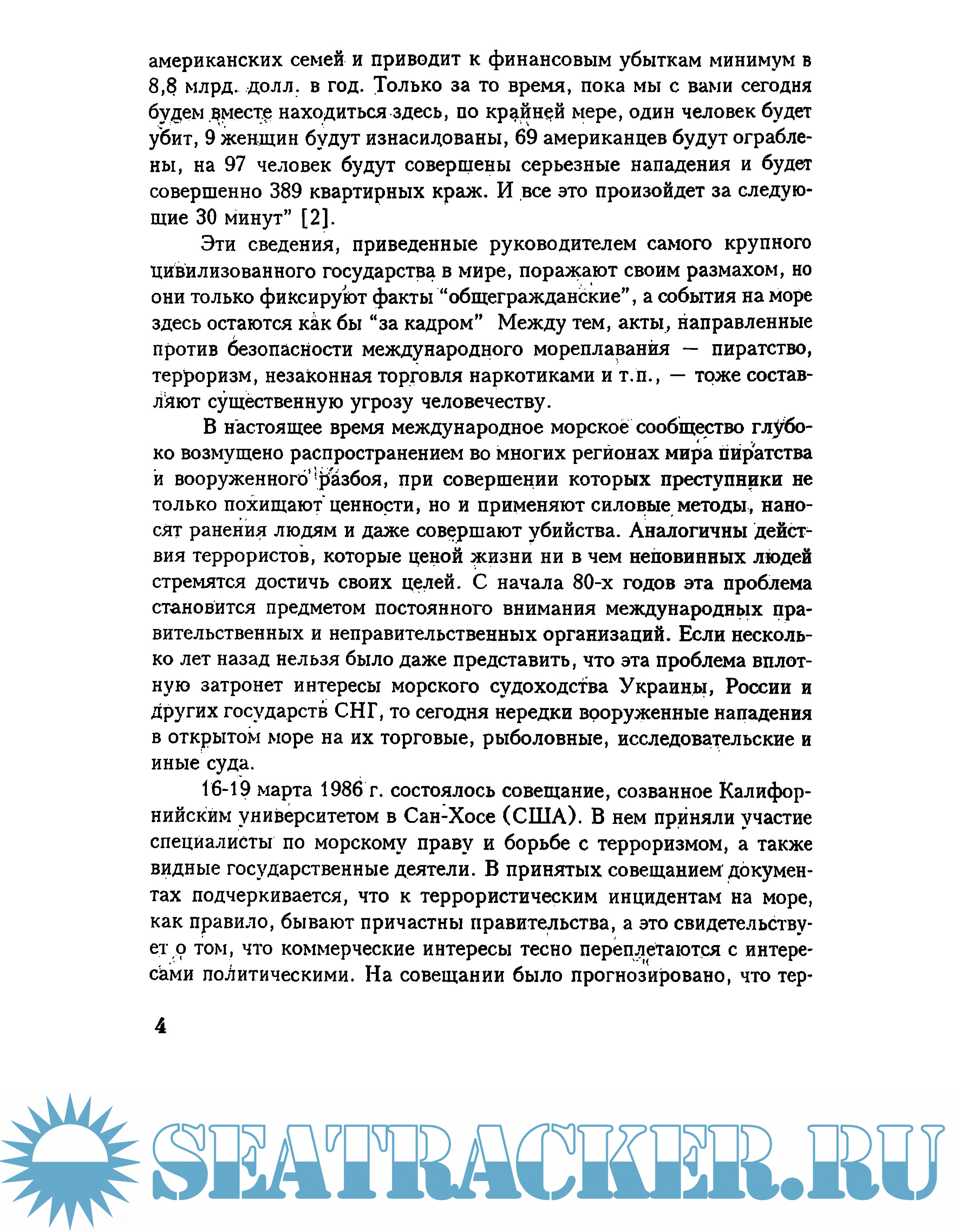 Описание: В книге содержатся исторические сведения о развитии пиратства, терроризма, мошенничества на море и о борьбе с этими и другими незаконными актами, направленными против безопасности мореплавания. Для курсантов, студентов морских и юридических учебных заведений, командного состава морских судов, работников эксплуатационных служб судовладельческих организаций, профессорско-преподавательского состава и научных работников, представляет интерес для всех, кто связан с торговым мореплаванием. Печатается по решению Ученого совета Одесской государственной морской академии.