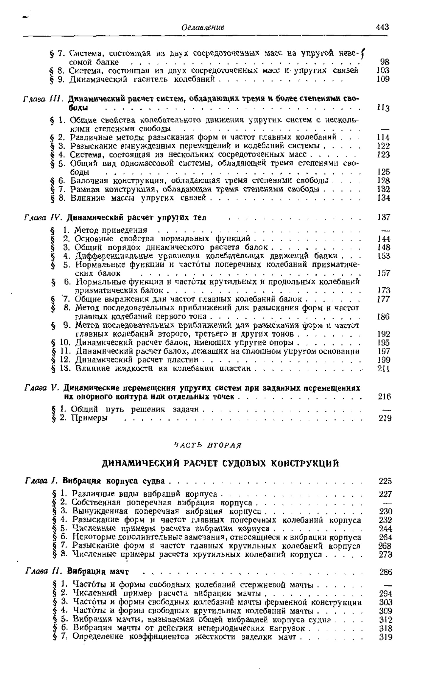 Во второй части изложена методика расчета вибрации корпуса судна, вибрации мачт, валопроводов, фундаментов и перекрытий, ледовых подкреплений корпуса, прочности корпуса на действие удара волн и динамические расчеты судовых конструкций на силы инерции при качке судна.