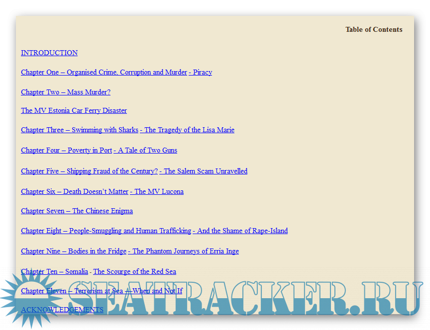 INTRODUCTION Chapter One – Organised Crime, Corruption and Murder - Piracy Chapter Two – Mass Murder? The MV Estonia Car Ferry Disaster Chapter Three – Swimming with Sharks - The Tragedy of the Lisa Marie Chapter Four – Poverty in Port - A Tale of Two Guns Chapter Five – Shipping Fraud of the Century? - The Salem Scam Unravelled Chapter Six – Death Doesn’t Matter - The MV Lucona Chapter Seven – The Chinese Enigma Chapter Eight – People-Smuggling and Human Trafficking - And the Shame of Rape-Island Chapter Nine – Bodies in the Fridge - The Phantom Journeys of Erria Inge Chapter Ten – Somalia - The Scourge of the Red Sea Chapter Eleven – Terrorism at Sea —When and Not If ACKNOWLEDGEMENTS