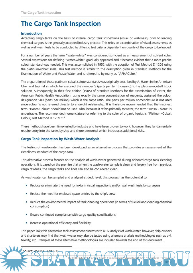 Description: The INTERTANKO tank cleanliness standards, first developed and published in 2011, were created to simplify the tank cleanliness verification process as well as to reduce the need for in-tank inspections. The objective was to provide the following benefits: