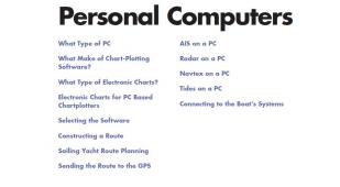 1 The Global Positioning System 2 Our Address on the Earth’s Surface 3 The Magnetic Compass 4 Constructing a Route 5 Tides 6 Boat Speed 7 Depth Sounders 8 Finding Position 9 Passage Planning 10 Pilotage 11 Automatic Identifi cation System 12 Radar 13 Autopilots 14 Personal Computers