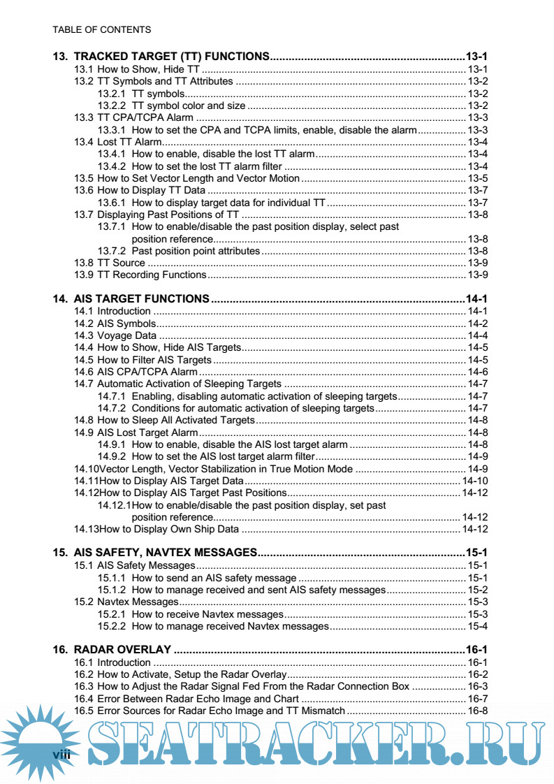 • Target data from TT (Tracked Target) and AIS transponder to aid in collision avoidance.
