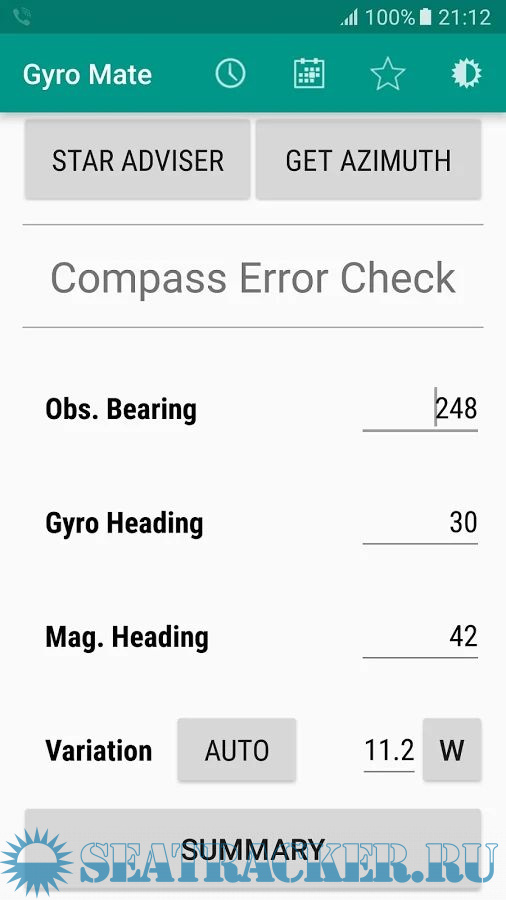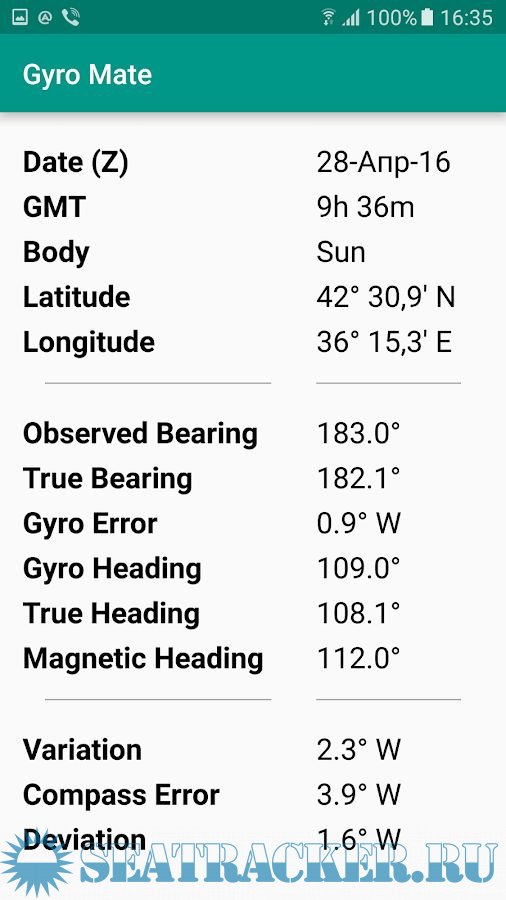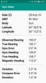 Once the azimuth is calculated, entering gyro bearing, heading, magnetic heading, variation will produce the result summary with all data required to keep the Compass Observation Book in right way.
