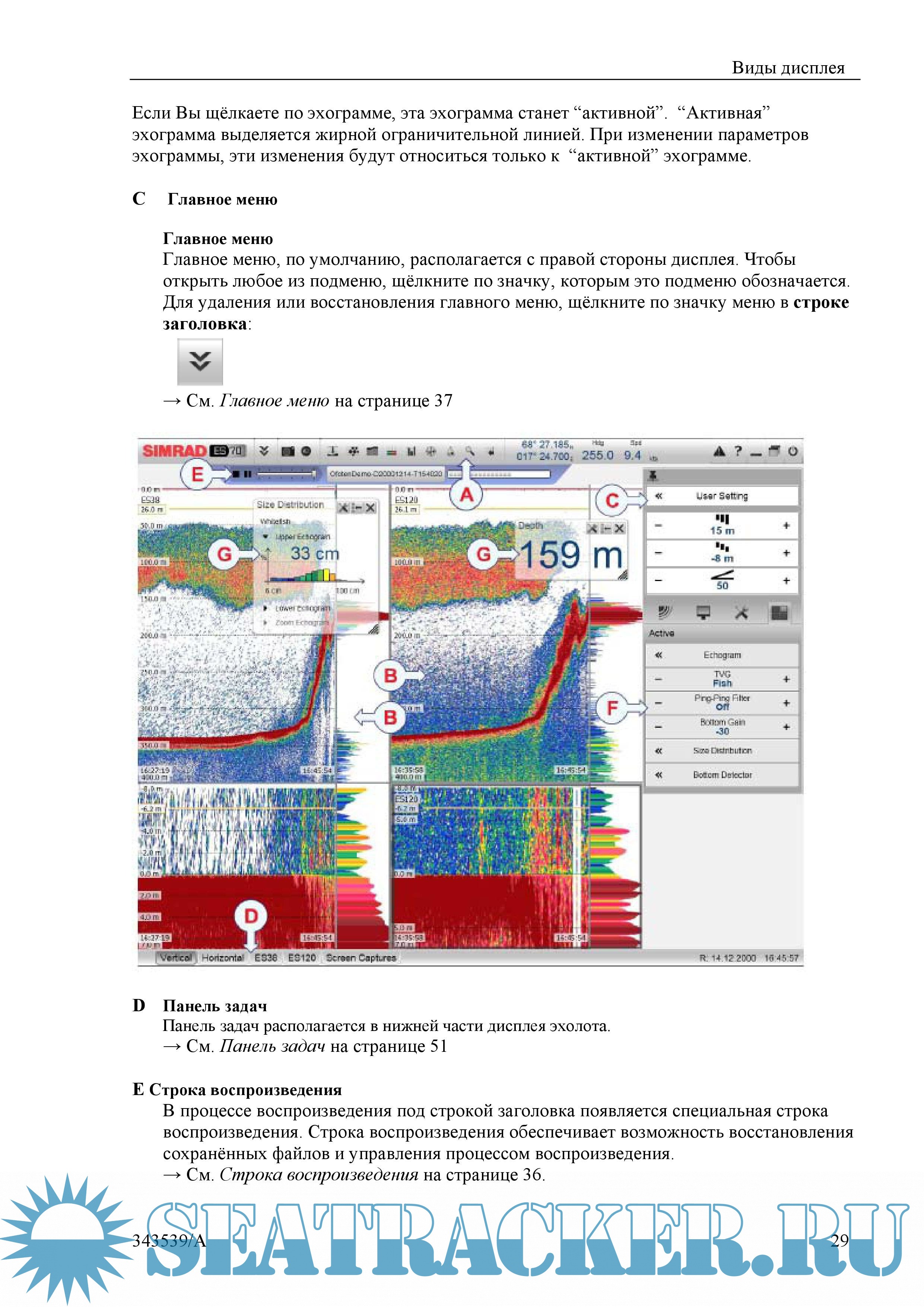 Общий обзор системы............................................................................................................10 Основные сведения.............................................................................................................10 Основные блоки..................................................................................................................10 Упрощённые схемы системы.............................................................................................12 Начало работы.............................................................................................................................13 Процедуры включения/выключения.....................................................................................13 Использование трекбола........................................................................................................15 Начало обычной работы.........................................................................................................15 Выбор рабочего режима.....................................................................................................16 Проверка установок трансивера и антенны.....................................................................16 Выбор установок обнаружения грунта.............................................................................17 Выбор установок цветовой шкалы....................................................................................17 Выбор установок распределения рыбы по размерам и расположения рыбы...............18 Выбор установок эхограммы.............................................................................................19 Выбор установок диапазона..............................................................................................21 Представление эхограмм.......................................................................................................22 Строка заголовка.....................................................................................................................23 Панель задач............................................................................................................................24 Система меню.........................................................................................................................24 Структура меню..................................................................................................................24 Клавиши меню....................................................................................................................25 Виды дисплея..............................................................................................................................28 Структура дисплея..................................................................................................................28 Строка заголовка.....................................................................................................................30 Логотип фирмы и наименование изделия........................................................................31 Операционные кнопки.......................................................................................................31 Обозначения информационных окон...............................................................................32 Навигационная информация..............................................................................................34 Функциональные кнопки...................................................................................................35 Строка воспроизведения........................................................................................................36 Главное меню..........................................................................................................................37 Эхограммы...............................................................................................................................37 Поверхностная эхограмма (Surface echogram).................................................................37 Донная эхограмма (Bottom echogram)..............................................................................38 Пелагическая эхограмма (Pelagic echogram)....................................................................39 Траловая эхограмма............................................................................................................40 Линии, маркеры и аннотации в эхограммах....................................................................40 Информационные окна...........................................................................................................43 Об информационных окнах...............................................................................................43 Информационное окно Depth (Глубина)..........................................................................44 Информационное окно Biomass (Биомасса)....................................................................44 Информационное окно Bottom Hardness (Твёрдость