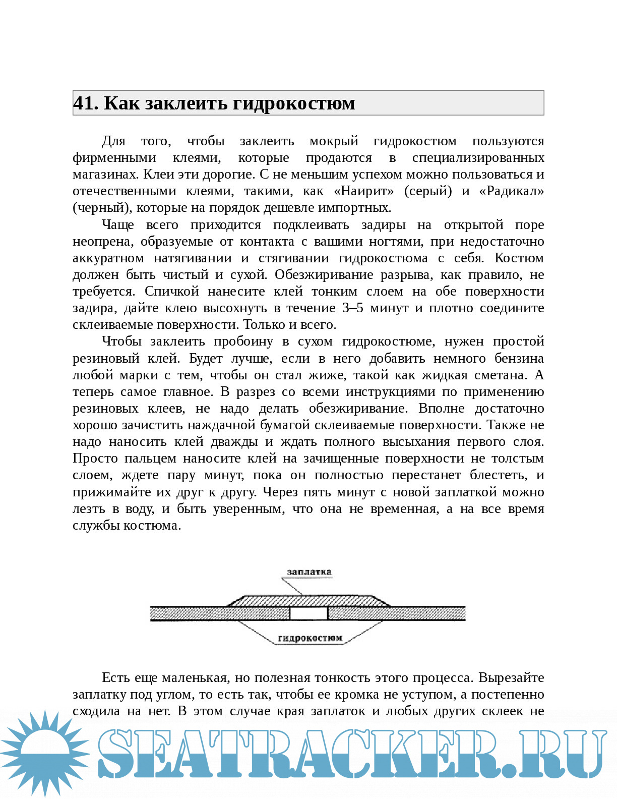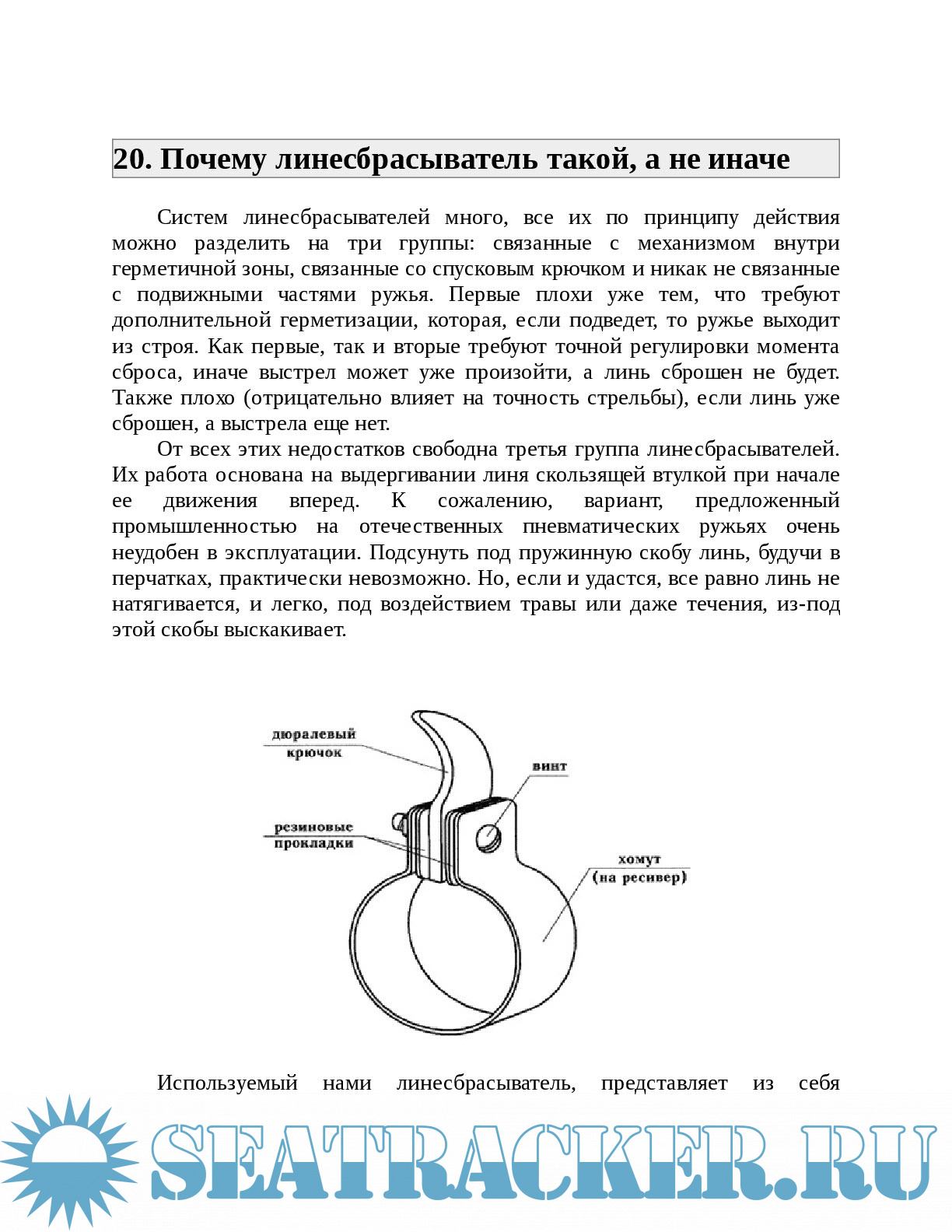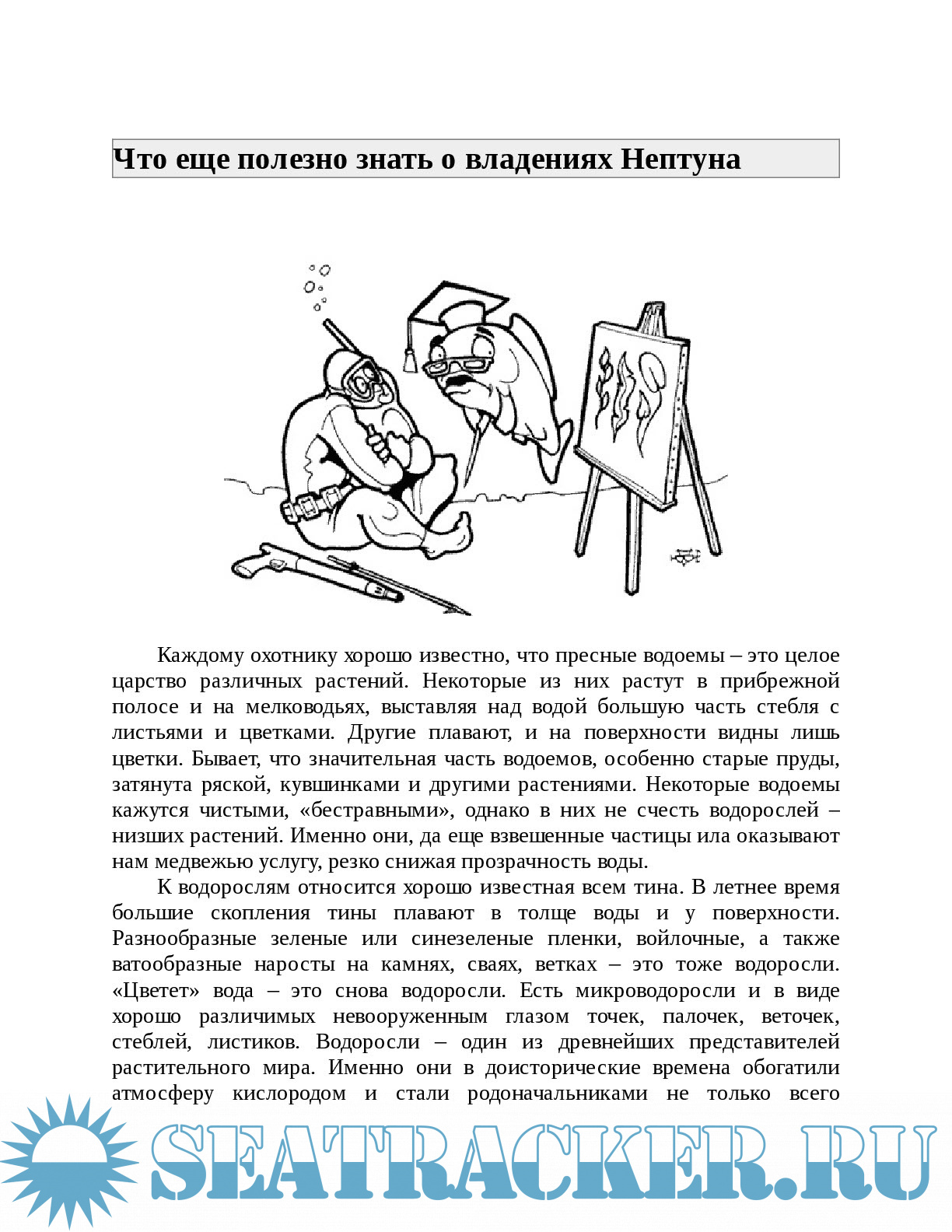 В. И. Виноградов К ЧИТАТЕЛЯМ Подводная охота по-русски В самом начале Река или море: вот в чем вопрос «Простая» подводная охота Ночная подводная охота Подводная охота зимой Уроки мастерства Охота в малых и горных реках Охота в больших реках Охота в озерах, карьерах и водохранилищах Наши вероятные противники Что еще полезно знать о владениях Нептуна Снаряжение: общие подходы и конкретные требования Права и обязанности каждого охотника Меры безопасности на подводной охоте Из рук в руки 1. Зачем нужно плавающее ружье и как этого добиться 2. Какого цвета ваше ружье 3. Как повысить КПД пневматического ружья 4. Модернизация магазинных ружей 5. Какой линь ставить на ружье 6. Малая модернизация магазинных одинарных наконечников 7. Как снизить подбрасывающий эффект у пневматического ружья 8. Как бороться с наклепами на поршне, стреле и скользящей втулке 9. Как усилить стрелу пневматического ружья с передним зацепом 10. Как заделывать концы гарпун-линя 11. Как обойтись без катушки 12. Клапан или простая затычка, на стравливающем соске сухого гидрокостюма 13. Как на «коленке» сделать верхний клапан на трубку 14. Как сделать хороший зимний многозуб 15. Почему трезубец должен быть длинным, но не широким 16. Что такое «угревый, пневый» наконечник 17. Малая модернизация маски 18. Как правильно распределить грузы и куканы на поясе 19. «Сковородка» на спине: плюсы и минусы 20. Почему линесбрасыватель такой, а не иначе 21. Можно ли ласты сделать более мягкими или более жесткими 22. Как увеличить калошу ваших ласт 23. Еще одна модернизация ласт с открытой пяткой 24. Что делать, если ласты бьют по воде 25. Если стрела вонзилась в бревно 26. Как изготовить сплавной мешок 27. Из чего должен состоять ЗИП и где его хранить 28. Если нет ЗИПа 29. Нужно ли ТО вашему снаряжению 30. Как днем не заблудиться в зарослях тростника и не потеряться на ночной охоте 1. 31. Как не замерзнуть на зимней охоте 32. Если на дворе мороз, а на вас мокрый гидрокостюм 33. Надо ли целиться в рыбу 34. Куда стрелять рыбу 35. Как поднимать добычу после выстрела 36. Как снимать рыбу со стрелы 37. Какую рыбу и как сажать на кукан 38. Как обезопасить уши от простуды и инфекции 39. Как облегчить влезание в гидрокостюм 40. Как продлить жизнь вашему гидрокостюму 41. Как заклеить гидрокостюм 42. Как хранить гидрокостюм 43. Как правильно говорить с рыбинспектором 44. Тотальное невезение и как с этим бороться 45. Что делать, если нельзя, но очень хочется 46. Одна машина, два охотника и вечный сплав 47. Возможности весенней охоты 48. Куда девать усы и бороду 49. Наземная экипировка подводного охотника 50. Еще один способ сохранить рыбу Используемая литература: notes