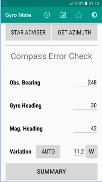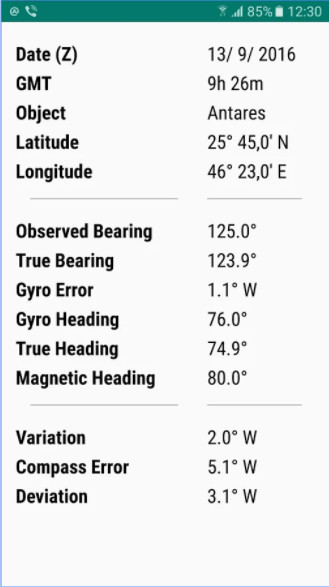 Once the azimuth is calculated, entering gyro bearing, heading, magnetic heading, variation will