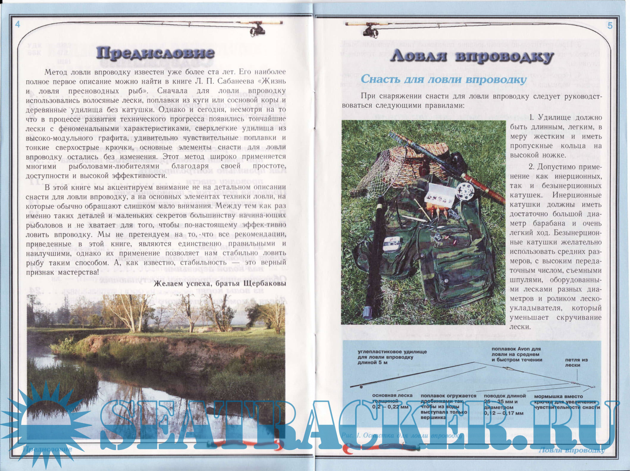 Предисловие Снасть для ловли впроводку Изготовление мормышки для ловли впроводку Как учитывать расстояние холостого проплыва оснастки при ловле впроводку Уменьшение расстояния холостого проплыва при помощи самопогружающегося поплавка Как правильно контролировать проводку снасти Проводка оснастки с периодическим придерживанием поплавка Почему рыба предпочитает держаться у дна Почему рыболов запаздывает с подсечкой Облавливание входа в яму и выхода из нее на реке Ловля впроводку под нависающими над водой деревьями Облавливание впроводку выступающих из воды коряг Ловля с помощью плоского поплавка Прикармливание рыбы при ловле впроводку