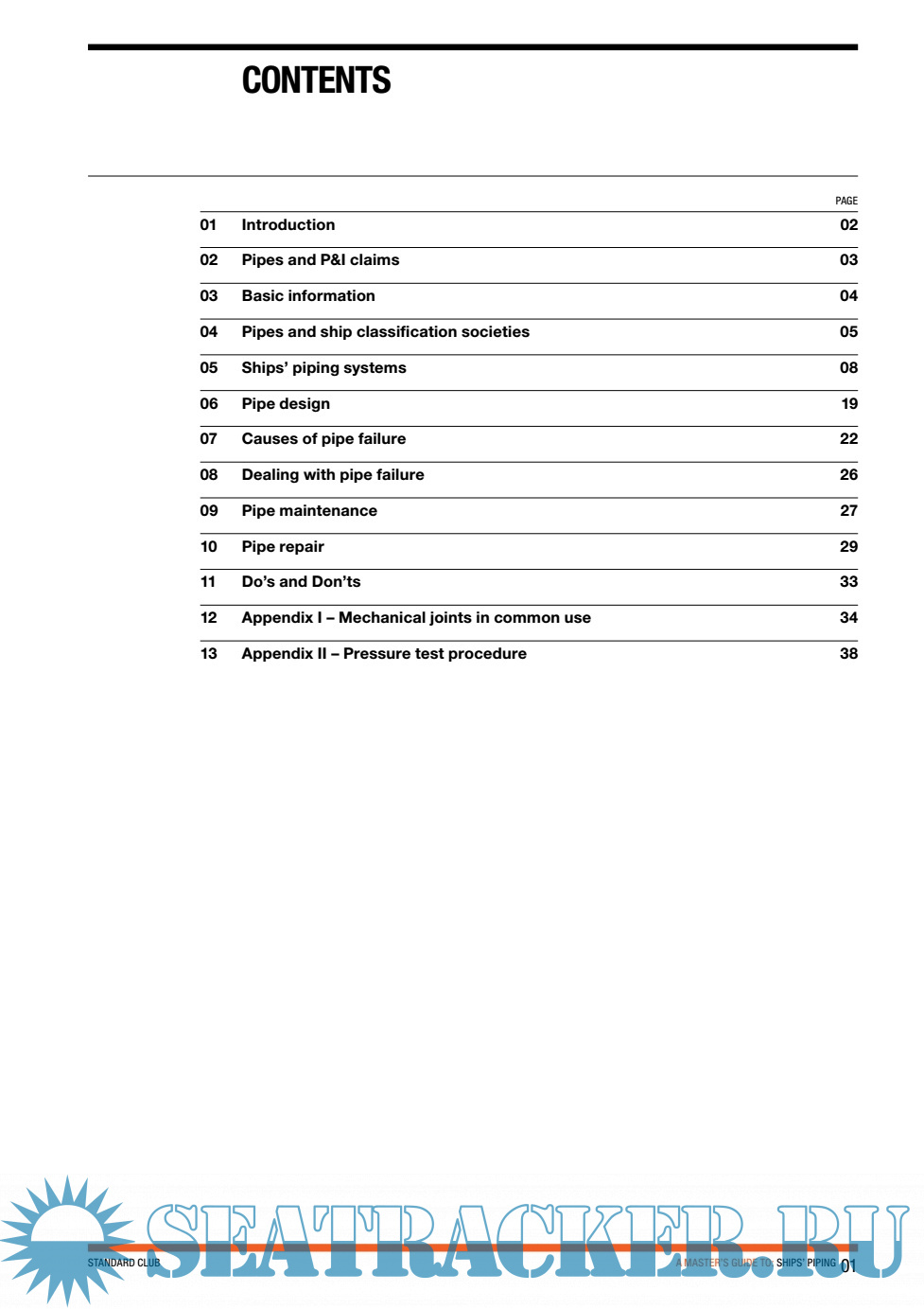 Introduction Pipes and P&I claims Basic information Pipes and ship classification societies Ships’ piping systems Pipe design Causes of pipe failure Dealing with pipe failure Pipe maintenance Pipe repair Do’s and Don’ts Appendix I – Mechanical joints in common use Appendix II – Pressure test procedure