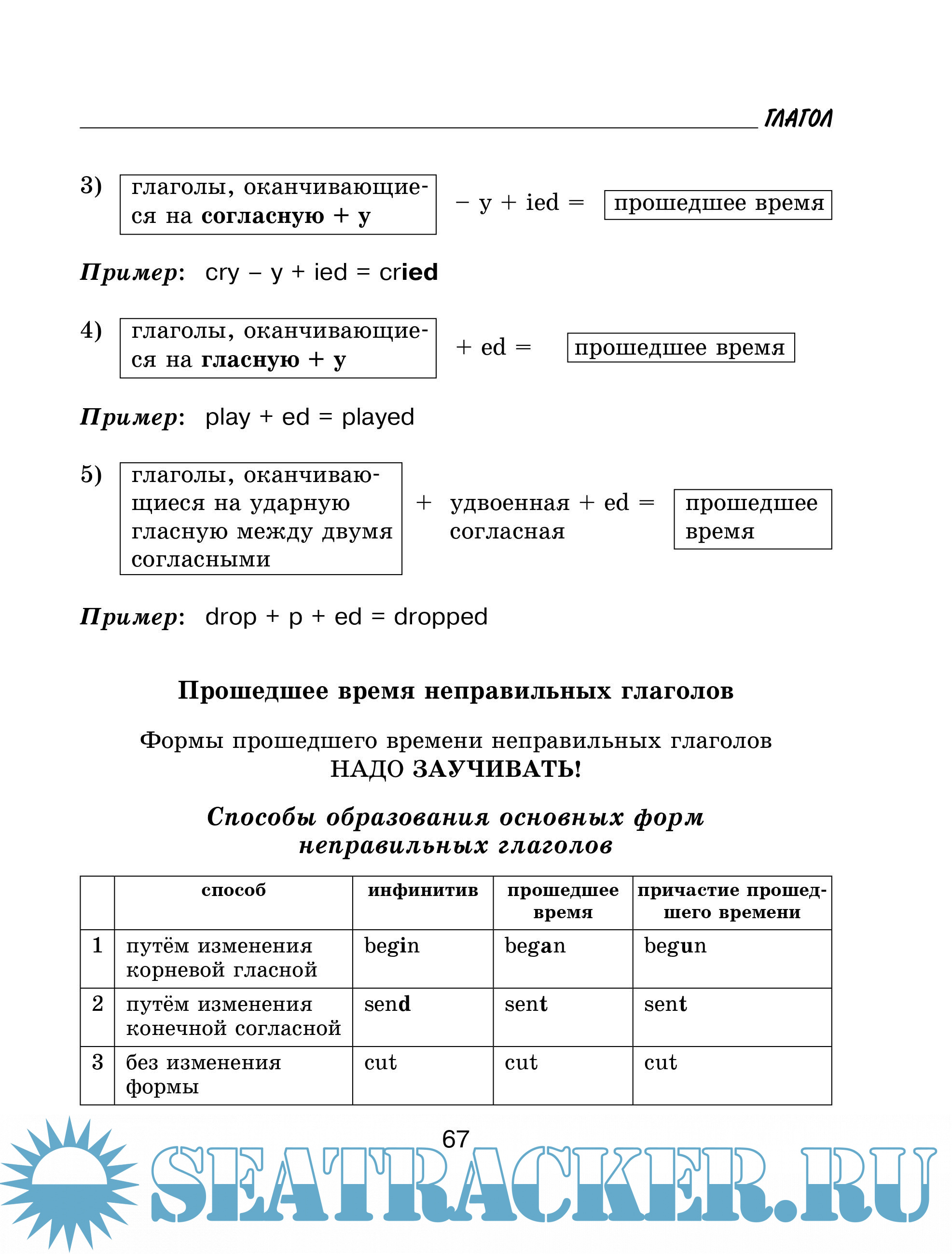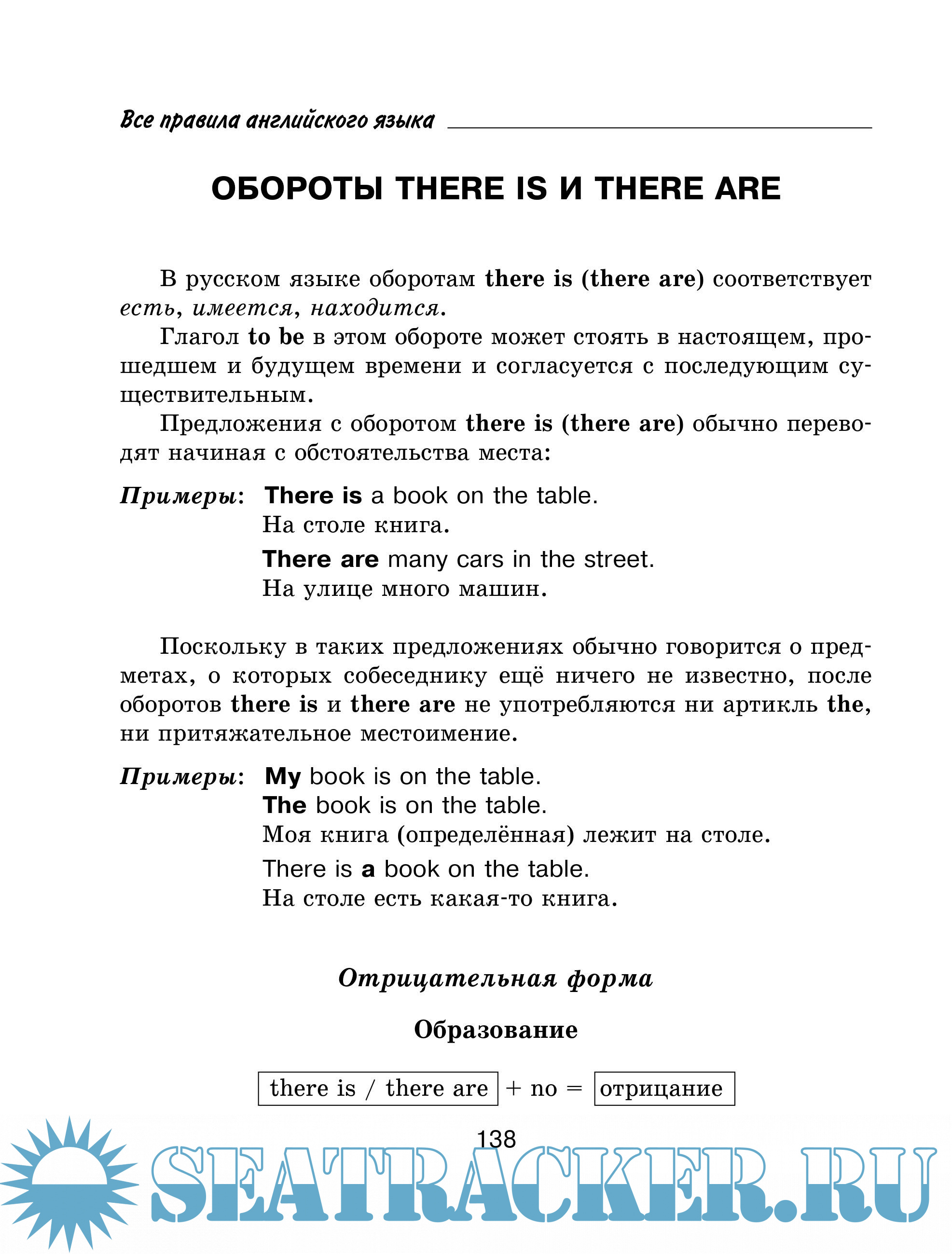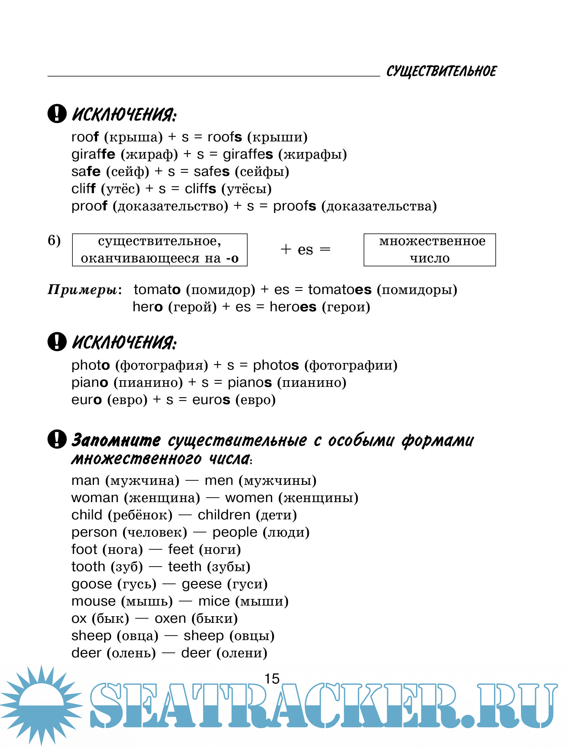 Артикль 6 Неопределённый артикль 7 Определённый артикль 8 Отсутствие артикля 10 Существительное 12 Исчисляемые и неисчисляемые существительные 12 Множественное число 13 Падежи существительных 16 Прилагательное 18 Классификация прилагательных 18 Степени сравнения прилагательных 19 Местоимение 23 Типы местоимений 23 Личные местоимения 24 Притяжательные местоимения 26 Возвратные местоимения 27 Указательные местоимения 29 Вопросительные местоимения 30 Отрицательные местоимения 31 Неопределённые местоимения 31 Числительное 35 Количественные числительные 35 Порядковые числительные 36 Дроби 38 Наречие 40 Классификация наречий по способу образования 40 Классификация наречий по значению 41 Степени сравнения наречий 42 Глагол 43 Классификация глаголов по способу образования 43 Личные и неличные формы глагола 43 Классификация глаголов по значению и выполняемой в предложении роли 44 Правильные и неправильные глаголы 45 Переходные и непереходные глаголы 45 Глагол to be — быть 46 Глагол to have — иметь, обладать, владеть 49 Модальные глаголы 52 Времена глагола 60 Настоящее простое время The Present Simple Tense 61 Прошедшее простое время The Past Simple Tense 65 Будущее простое время The Future Simple Tense 74 Конструкция to be going to 77 Настоящее продолженное время The Present Continuous Tense 78 Прошедшее продолженное время The Past Continuous Tense. 81 Будущее продолженное время The Future Continuous Tense 84 Настоящее совершенное время The Present Perfect Tense 85 Прошедшее совершенное время The Past Perfect Tense 88 Будущее совершенное время The Future Perfect Tense 90 Настоящее совершенное продолженное время The Present Perfect Continuous Tense 92 Прошедшее и будущее совершенное продолженное время The Past and The Future Perfect Continuous Tense 93 Будущее-в-прошедшем Future-in-the-Past 94 Правило согласования времён 95 Перевод прямой речи в косвенную 97 Наклонение 99 Повелительное наклонение 100 Сослагательное наклонение 101 Залог 103 Употребление 103 Страдательный залог 104 Неличные формы глагола 110 Инфинитив 110 Причастие 113 Причастие настоящего времени (Причастие I) 113 Причастие прошедшего времени (Причастие II) 115 Герундий 121 Предлог 126 Порядок слов в предложении 137 Обороты there is и there are 138 Сложное подлежащее 140 Сложное дополнение 142 Безличные предложения 144 Вопросительные предложения 144 Общий вопрос 144 Вопрос к подлежащему 145 Разделительный вопрос 145 Альтернативный вопрос 145 Специальный вопрос 146 Вопросительные слова 146 Ответы на вопросы 147 Косвенный вопрос 148 Сложносочинённые предложения 149 Сложноподчинённые предложения 150 Условные предложения 152 Таблица неправильных глаголов 154 Иллюстрированный словарь 160