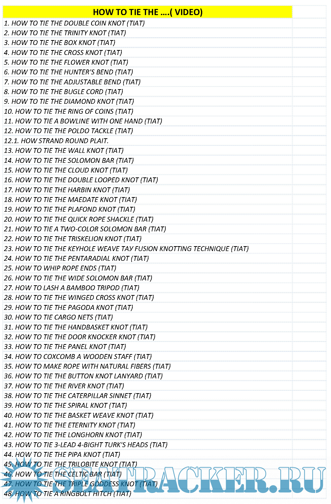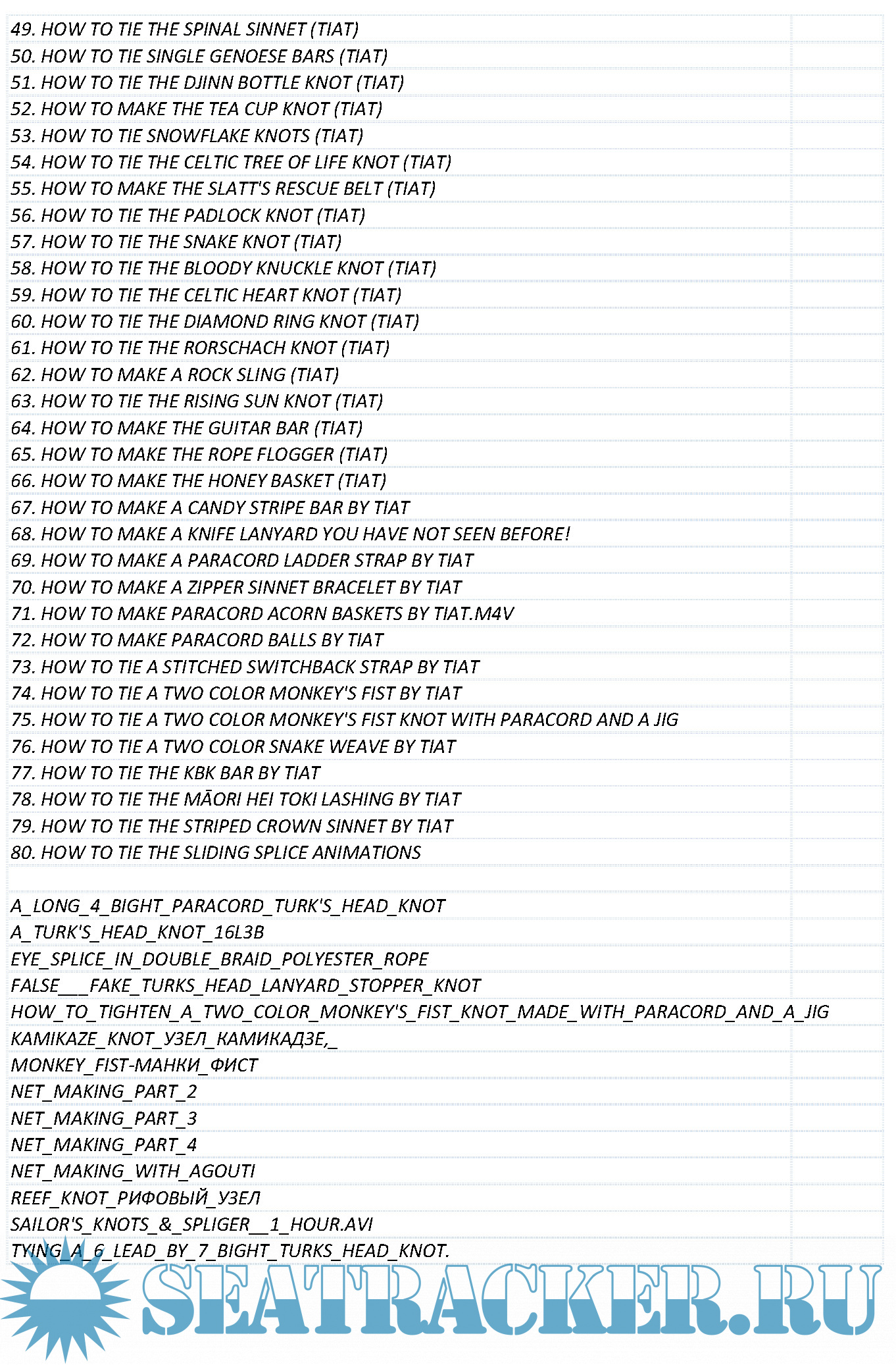 1. HOW TO TIE THE DOUBLE COIN KNOT (TIAT) 2. HOW TO TIE THE TRINITY KNOT (TIAT) 3. HOW TO TIE THE BOX KNOT (TIAT) 4. HOW TO TIE THE CROSS KNOT (TIAT) 5. HOW TO TIE THE FLOWER KNOT (TIAT) 6. HOW TO TIE THE HUNTER'S BEND (TIAT) 7. HOW TO TIE THE ADJUSTABLE BEND (TIAT) 8. HOW TO TIE THE BUGLE CORD (TIAT) 9. HOW TO TIE THE DIAMOND KNOT (TIAT) 10. HOW TO TIE THE RING OF COINS (TIAT) 11. HOW TO TIE A BOWLINE WITH ONE HAND (TIAT) 12. HOW TO TIE THE POLDO TACKLE (TIAT) 12.1. HOW STRAND ROUND PLAIT. 13. HOW TO TIE THE WALL KNOT (TIAT) 14. HOW TO TIE THE SOLOMON BAR (TIAT) 15. HOW TO TIE THE CLOUD KNOT (TIAT) 16. HOW TO TIE THE DOUBLE LOOPED KNOT (TIAT) 17. HOW TO TIE THE HARBIN KNOT (TIAT) 18. HOW TO TIE THE MAEDATE KNOT (TIAT) 19. HOW TO TIE THE PLAFOND KNOT (TIAT) 20. HOW TO TIE THE QUICK ROPE SHACKLE (TIAT) 21. HOW TO TIE A TWO-COLOR SOLOMON BAR (TIAT) 22. HOW TO TIE THE TRISKELION KNOT (TIAT) 23. HOW TO TIE THE KEYHOLE WEAVE ТАУ FUSION KNOTTING TECHNIQUE (TIAT) 24. HOW TO TIE THE PENTARADIAL KNOT (TIAT) 25. HOW TO WHIP ROPE ENDS (TIAT) 26. HOW TO TIE THE WIDE SOLOMON BAR (TIAT) 27. HOW TO LASH A BAMBOO TRIPOD (TIAT) 28. HOW TO TIE THE WINGED CROSS KNOT (TIAT) 29. HOW TO TIE THE PAGODA KNOT (TIAT) 30. HOW TO TIE CARGO NETS (TIAT) 31. HOW TO TIE THE HANDBASKET KNOT (TIAT) 32. HOW TO TIE THE DOOR KNOCKER KNOT (TIAT) 33. HOW TO TIE THE PANEL KNOT (TIAT) 34. HOW TO COXCOMB A WOODEN STAFF (TIAT) 35. HOW TO MAKE ROPE WITH NATURAL FIBERS (TIAT) 36. HOW TO TIE THE BUTTON KNOT LANYARD (TIAT) 37. HOW TO TIE THE RIVER KNOT (TIAT) 38. HOW TO TIE THE CATERPILLAR SINNET (TIAT) 39. HOW TO TIE THE SPIRAL KNOT (TIAT) 40. HOW TO TIE THE BASKET WEAVE KNOT (TIAT) 41. HOW TO TIE THE ETERNITY KNOT (TIAT) 42. HOW TO TIE THE LONGHORN KNOT (TIAT) 43. HOW TO TIE 3-LEAD 4-BIGHT TURK'S HEADS (TIAT) 44. HOW TO TIE THE PIPA KNOT (TIAT) 45. HOW TO TIE THE TRILOBITE KNOT (TIAT) 46. HOW TO TIE THE CELTIC BAR (TIAT) 47. HOW TO TIE THE TRIPLE GODDESS KNOT (TIAT) 48. HOW TO TIE A RINGBOLT HITCH (TIAT) 49. HOW TO TIE THE SPINAL SINNET (TIAT) 50. HOW TO TIE SINGLE GENOESE BARS (TIAT) 51. HOW TO TIE THE DJINN BOTTLE KNOT (TIAT) 52. HOW TO MAKE THE TEA CUP KNOT (TIAT) 53. HOW TO TIE SNOWFLAKE KNOTS (TIAT) 54. HOW TO TIE THE CELTIC TREE OF LIFE KNOT (TIAT) 55. HOW TO MAKE THE SLATT'S RESCUE BELT (TIAT) 56. HOW TO TIE THE PADLOCK KNOT (TIAT) 57. HOW TO TIE THE SNAKE KNOT (TIAT) 58. HOW TO TIE THE BLOODY KNUCKLE KNOT (TIAT) 59. HOW TO TIE THE CELTIC HEART KNOT (TIAT) 60. HOW TO TIE THE DIAMOND RING KNOT (TIAT) 61. HOW TO TIE THE RORSCHACH KNOT (TIAT) 62. HOW TO MAKE A ROCK SLING (TIAT) 63. HOW TO TIE THE RISING SUN KNOT (TIAT) 64. HOW TO MAKE THE GUITAR BAR (TIAT) 65. HOW TO MAKE THE ROPE FLOGGER (TIAT) 66. HOW TO MAKE THE HONEY BASKET (TIAT) 67. HOW TO MAKE A CANDY STRIPE BAR BY TIAT 68. HOW TO MAKE A KNIFE LANYARD YOU HAVE NOT SEEN BEFORE! 69. HOW TO MAKE A PARACORD LADDER STRAP BY TIAT 70. HOW TO MAKE A ZIPPER SINNET BRACELET BY TIAT 71. HOW TO MAKE PARACORD ACORN BASKETS BY TIAT.M4V 72. HOW TO MAKE PARACORD BALLS BY TIAT 73. HOW TO TIE A STITCHED SWITCHBACK STRAP BY TIAT 74. HOW TO TIE A TWO COLOR MONKEY'S FIST BY TIAT 75. HOW TO TIE A TWO COLOR MONKEY'S FIST KNOT WITH PARACORD AND A JIG 76. HOW TO TIE A TWO COLOR SNAKE WEAVE BY TIAT 77. HOW TO TIE THE KBK BAR BY TIAT 78. HOW TO TIE THE MĀORI HEI TOKI LASHING BY TIAT 79. HOW TO TIE THE STRIPED CROWN SINNET BY TIAT 80. HOW TO TIE THE SLIDING SPLICE ANIMATIONS A_LONG_4_BIGHT_PARACORD_TURK'S_HEAD_KNOT A_TURK'S_HEAD_KNOT_16L3B EYE_SPLICE_IN_DOUBLE_BRAID_POLYESTER_ROPE FALSE___FAKE_TURKS_HEAD_LANYARD_STOPPER_KNOT HOW_TO_TIGHTEN_A_TWO_COLOR_MONKEY'S_FIST_KNOT_MADE_WITH_PARACORD_AND_A_JIG KAMIKAZE_KNOT_УЗЕЛ_КАМИКАДЗЕ,_ MONKEY_FIST-МАНКИ_ФИСТ NET_MAKING_PART_2 NET_MAKING_PART_3 NET_MAKING_PART_4 NET_MAKING_WITH_AGOUTI REEF_KNOT_РИФОВЫЙ_УЗЕЛ SAILOR'S_KNOTS_&_SPLIGER__1_HOUR.AVI TYING_A_6_LEAD_BY_7_BIGHT_TURKS_HEAD_KNOT.