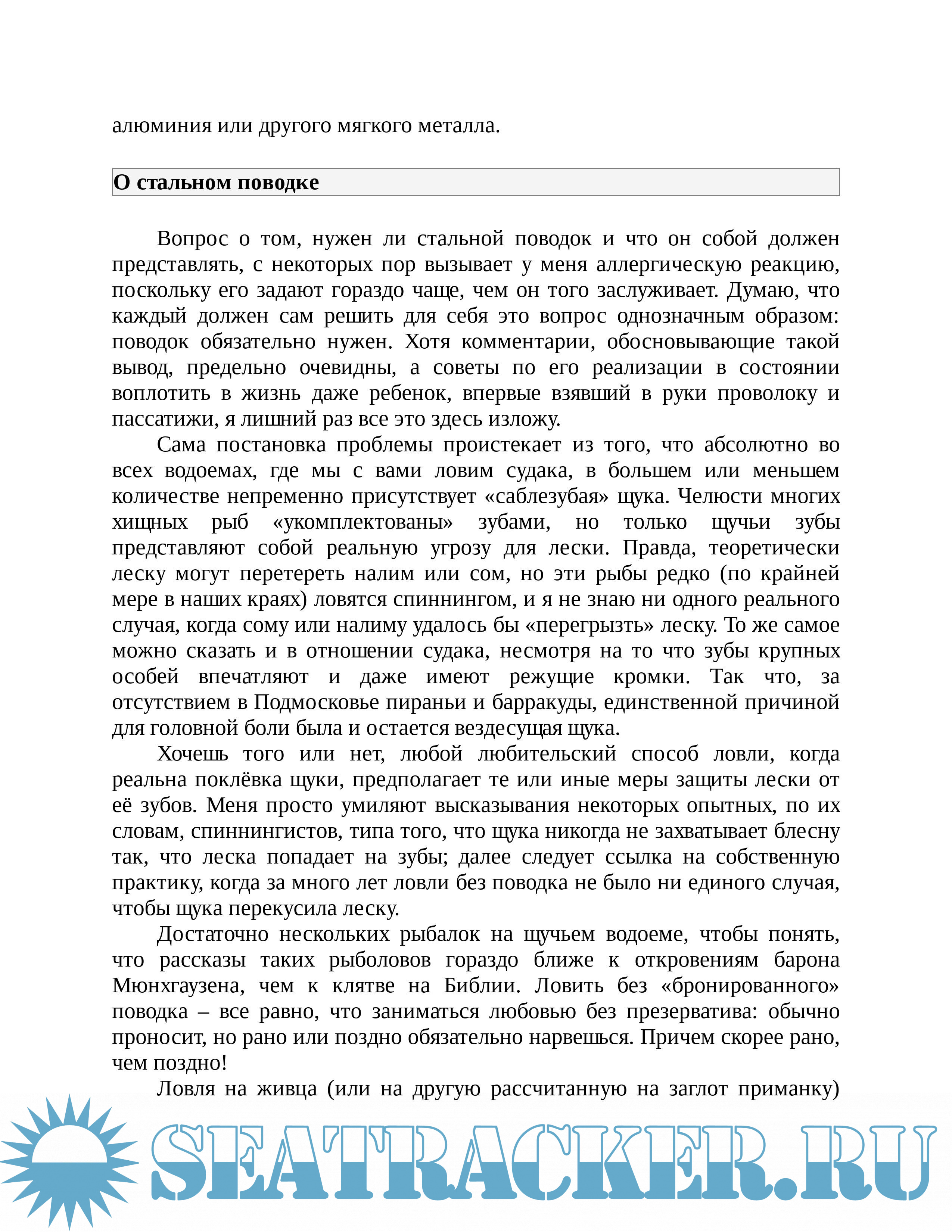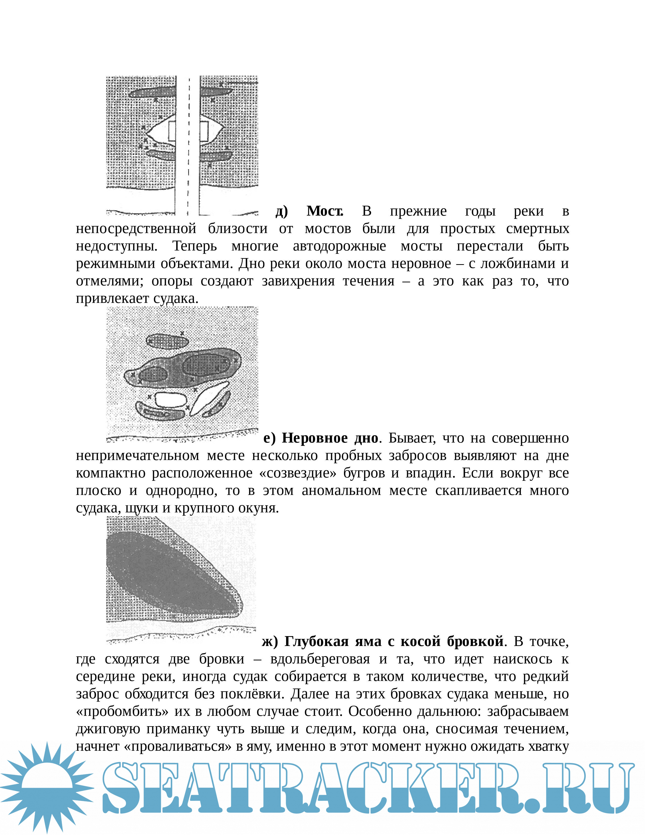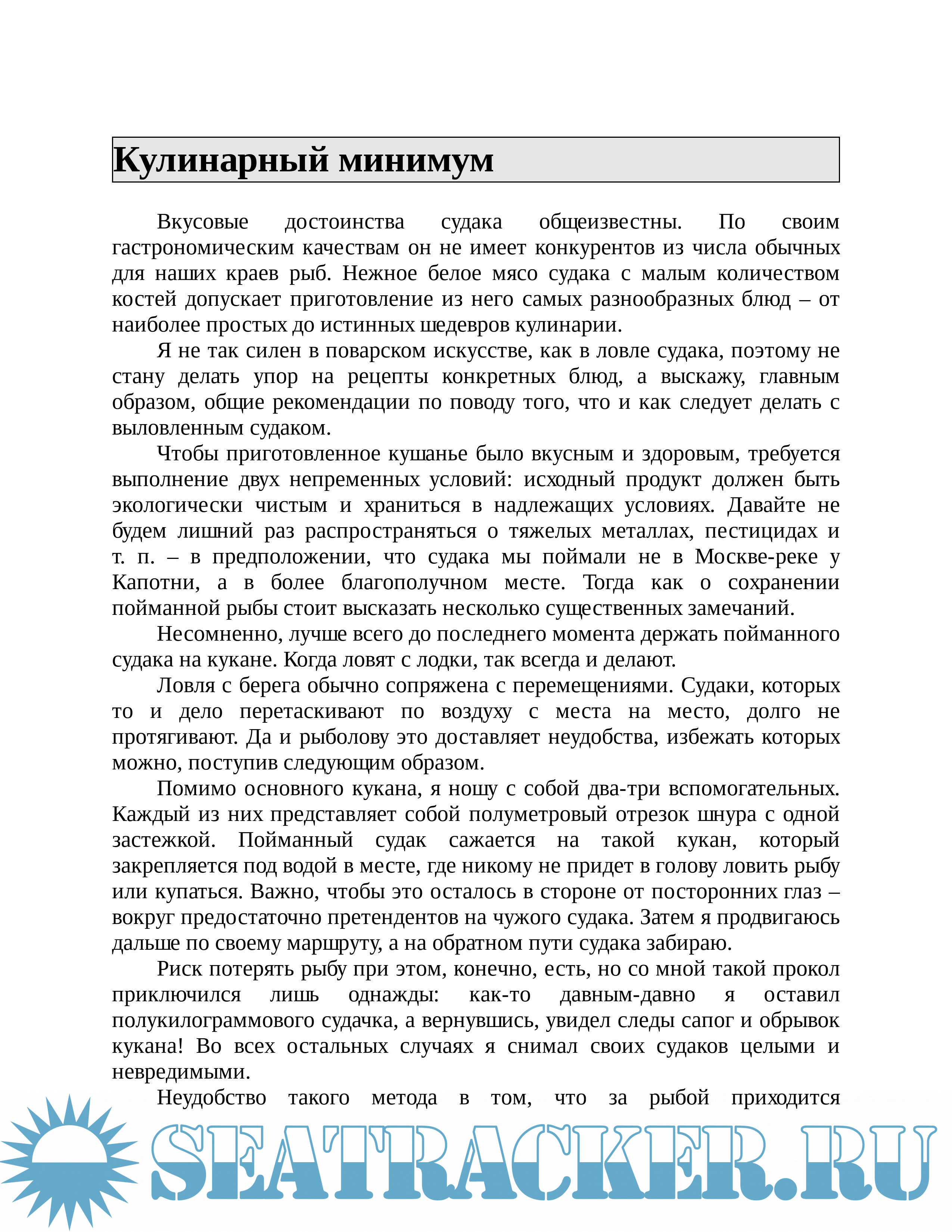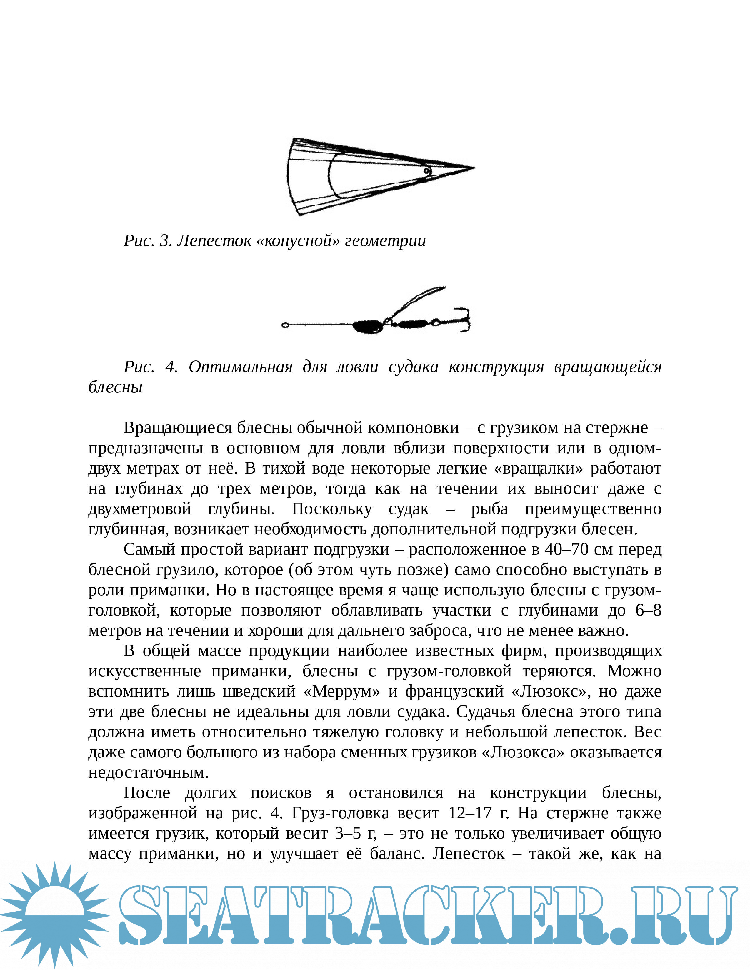 От автора Введение Распространение, биология, образ жизни судака Снасть Удилище Катушка Леска А чем же Кузьмин ловит судака сам? Приманка Колеблющиеся блесны Вращающиеся блесны Свинцовый грузик Воблеры Поролоновые и пластиковые рыбки Другие джиговые приманки Изыскания в «спектральном» анализе Мертвые рыбки Другие естественные приманки Несколько общих комментариев О крючках О стальном поводке Об отношении к новым приманкам Год судака Тактика поиска и ловли Ситуация 1. Ловля на преднерестовом ходе в реках Ситуация 2. Летняя ловля на водоеме озерного типа с расслоением воды Ситуация 3. Летняя прибрежная ловля на течении Ситуация 4. Ловля в протоках, ериках и рукавах южных рек – главным образом, на их предустьевых участках Ситуация 5. Летнее-осенняя ловля в реках на средних и больших глубинах Элементы гидрографической схемы Ситуация 6. Ловля на широких неглубоких плесах больших рек Ситуация 7. Глубинная ловля в стоячей воде Проводка, поклёвка, подсечка Вываживание Кулинарный минимум Литература Об авторе