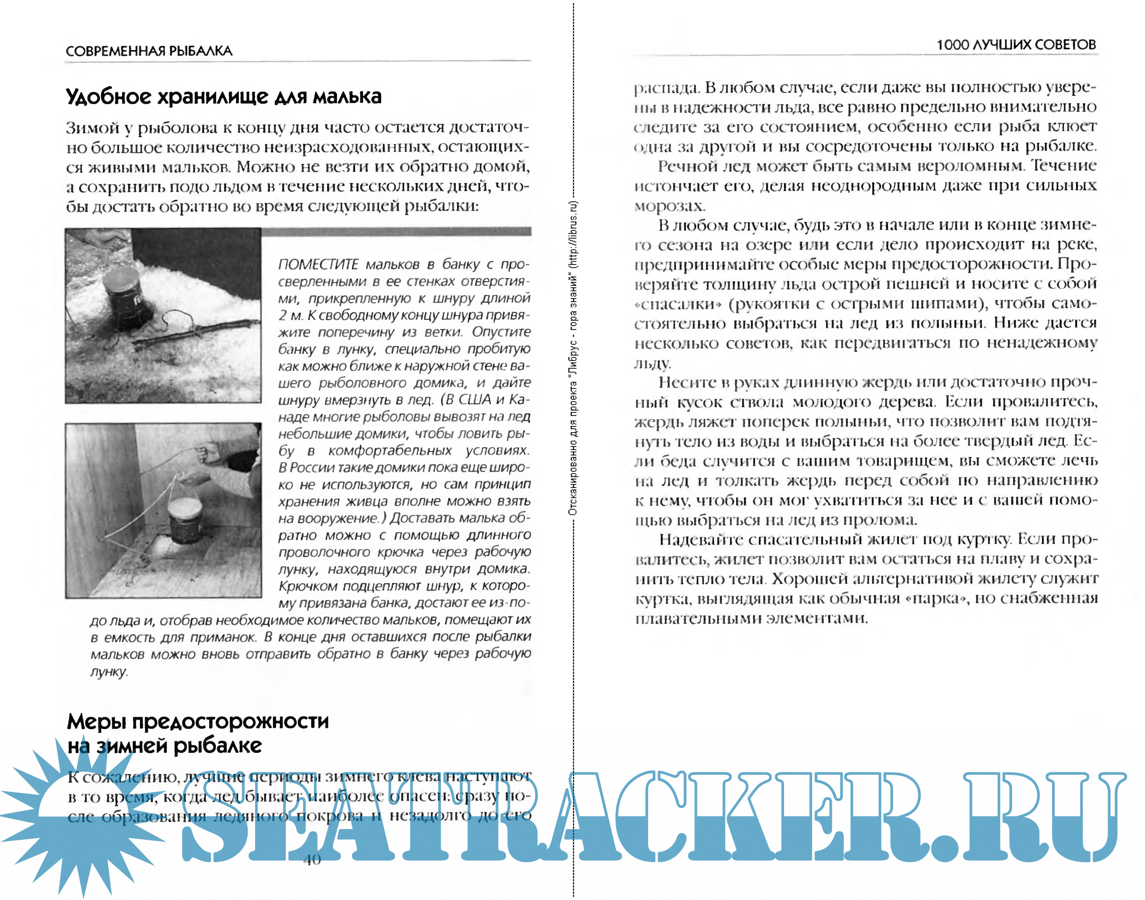 Предисловие переводчика 5 Введение 7 Глава 1. Советы знаменитых рыболовов 10 Глава 2. Общие советы 18 Глава 3. Советы по ловле трофейной рыбы 46 Глава 4. Изготовление и усовершенствование приманок своими руками 134 Глава 5. Советы по снастям 156 Глава 6. Советы по оборудованию 198 Глава 7. После того как рыба поймана 228
