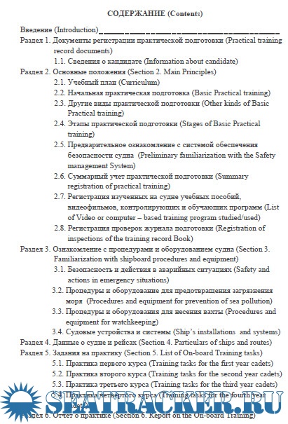 СОДЕРЖАНИЕ (Contents) Введение (Introduction) ________________________________________________________ Рзздел 1. Документы регистр ап ни практической подготовки (Practical training record documents) 1.1. Сведения о кандидате (Information about candidate) Раздел 2. Основные положения (Section 2. Main Principles) 2.1. Учебный план (Curriculum) 2.2. Начальная практическая подготовка (Basic Practical training) 2.3. Другие виды практической подготовки (Other kinds of Basic Practical training) 2.4. Этапы практической подготовки (Stages of Basic Practical training) 2.5. Предварительное ознакомление с системой обеспечения безопасности судна (Preliminary familiarization with the Safety management System) 2.6. Суммарный учет практической подготовки (Summary registration of practical training) 2.7. Регистр алия изученных на судне учебных пособий, видеофильмов, контролирующих и обучающих программ (List of Video or computer - based training program studied'used) 2.S. Регистрация проверок журнала подготовки (Registration of inspections of the training record Book) Раздел 3. Ознакомление с процедурами и оборудованием судна (Section 3. Familiarization with shipboard procedures and equipment) 3.1. Безопасность и действия в аварийных ситу алиях (Safety and actions m emergency situations) 3.2. Процедуры и оборудование для предотвращения загрязнения моря (Procedures and equipment for prevention of sea pollution) 3.3. Процедуры и оборудования для несения вахты (Procedures and equipment for watchkeeping) 3.4. Судовые устройства и системы (Ship’s installations and systems) Раздел 4. Данные о судне и рейсах (Section 4. Particulars of ships and routes) Раздел 5. Задания на практику (Section 5. List of On-board Training tasks) 5.1. Практика первого курса (Training tasks for the first year cadets) 5.2. Практика второго курса (Training tasks for the second year cadets) 5.3. Практика третьего курса (Training tasks for the third year cadets) 5.4. Практика четвертого курса (Training tasks for the fourth year cadets) Раздел 6. Отчет о практике (Secnon 6. Report on the On-board Training)