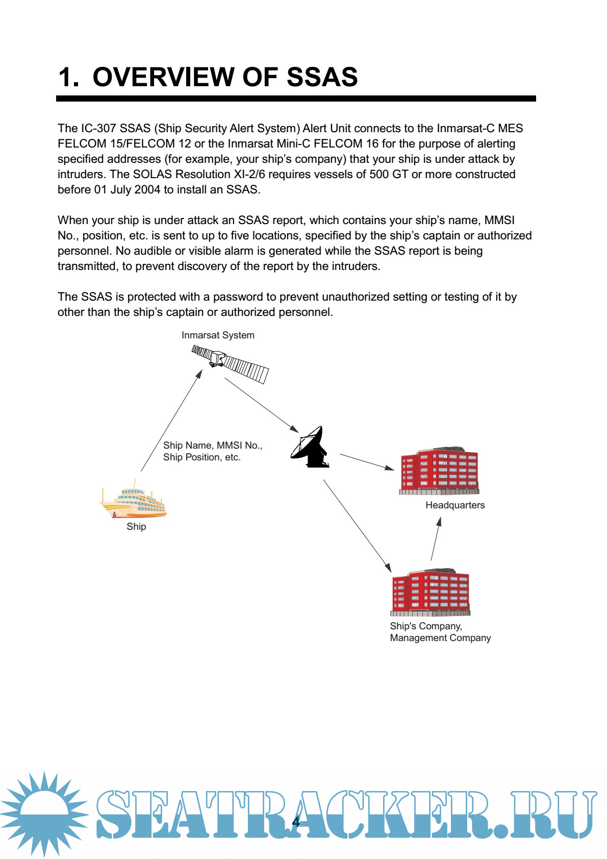 Year: 2008 Language: english Author: Furuno Genre: Manual Publisher: F Edition: D1 Format: PDF Quality: eBook Pages count: 38 Description: The IC-307 SSAS (Ship Security Alert System) Alert Unit connects to the Inmarsat-C MES FELCOM 15/FELCOM 12 or the Inmarsat Mini-C FELCOM 16 for the purpose of alerting specified addresses (for example, your ship’s company) that your ship is under attack by intruders. The SOLAS Resolution XI-2/6 requires vessels of 500 GT or more constructed before 01 July 2004 to install an SSAS. When your ship is under attack an SSAS report, which contains your ship’s name, MMSI No., position, etc. is sent to up to five locations, specified by the ship’s captain or authorized personnel. No audible or visible alarm is generated while the SSAS report is being transmitted, to prevent discovery of the report by the intruders. The SSAS is protected with a password to prevent unauthorized setting or testing of it by other than the ship’s captain or authorized personnel.