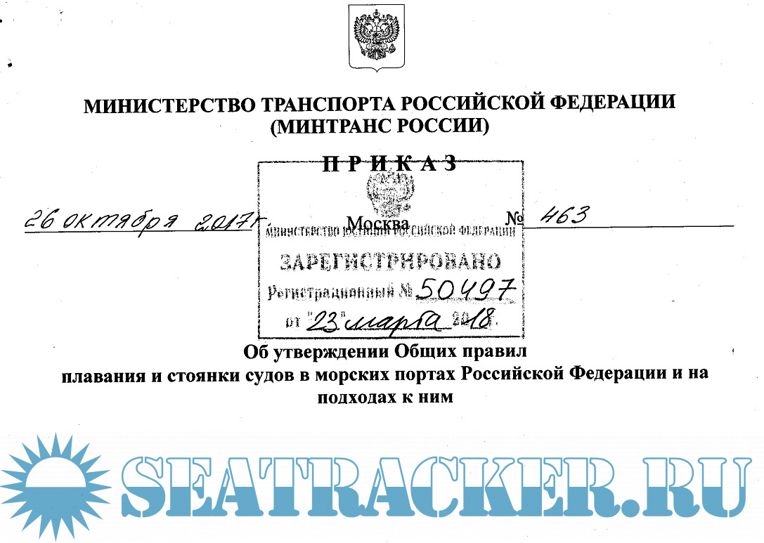 Описание: "Общие правила плавания и стоянка судов в морских портах Российской Федерации и на подходах к ним" утверждены 26 октября 2017 года, опубликованы 26 марта 2018 года и вступают в силу с 06 апреля 2018 года.