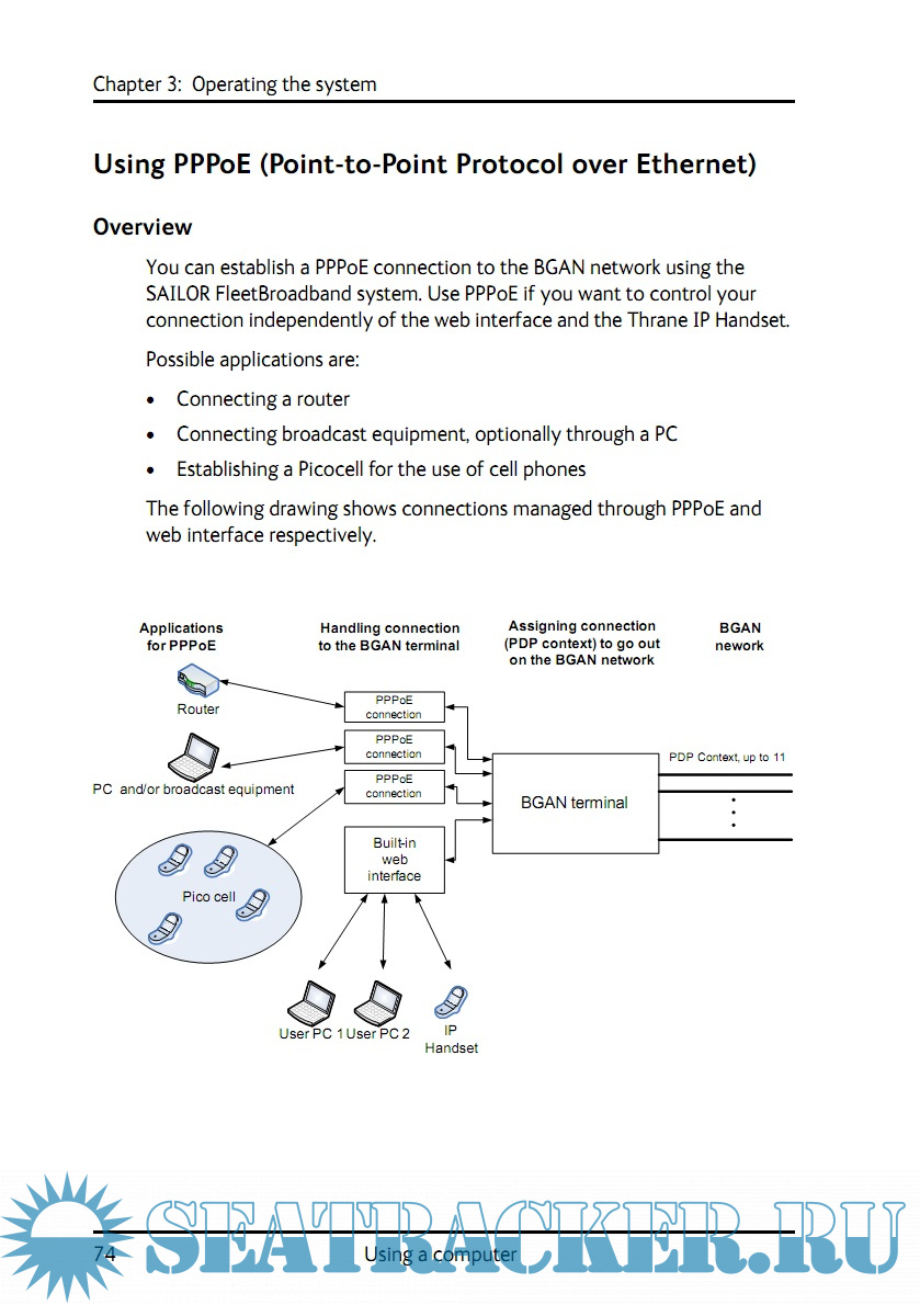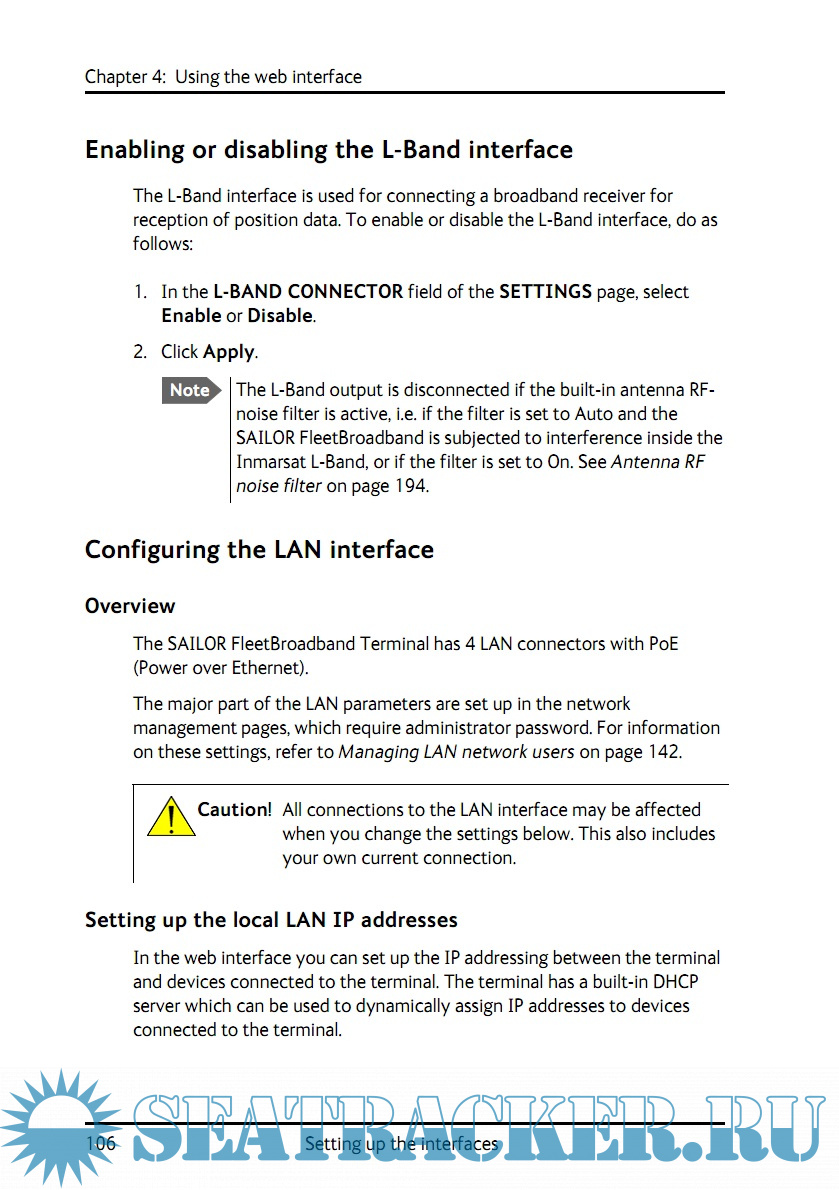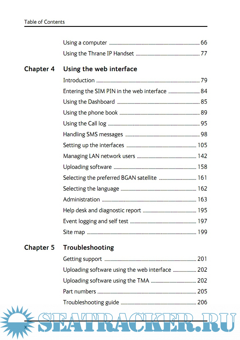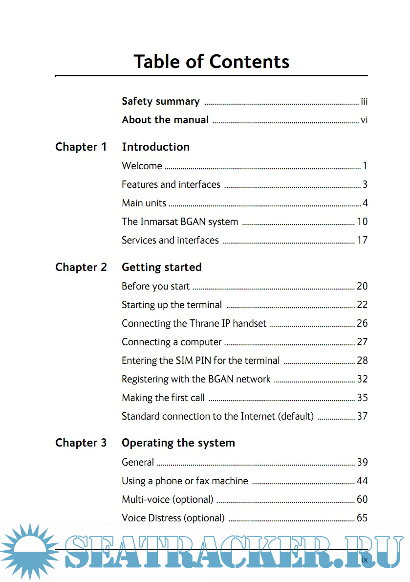 Year: 2013 Language: english Author: Thrane & Thrane A/S Genre: Manual Publisher: Thrane & Thrane A/S Format: PDF Quality: eBook Pages count: 278 Description: SAILOR 500 FleetBroadband and SAILOR 250 FleetBroadband are maritime broadband systems, providing simultaneous high-speed data and voice communication via satellite through the BGAN (Broadband Global Area Network). Features and interfaces The SAILOR FleetBroadband System offers the following features and interfaces: Simultaneous voice and data communication over BGAN Full duplex, single or multi-user, up to: SAILOR 500 FleetBroadband: 492 kbps SAILOR 250 FleetBroadband: 284 kbps Support for streaming IP at: SAILOR 500 FleetBroadband: 8, 16, 32, 64, 128 and 256 kbps SAILOR 250 FleetBroadband: 8, 16, 32, 64 and 128 kbps ISDN (Integrated Services Digital Network) service, only SAILOR 500 FleetBroadband: 64 kbps Voice: Standard Voice (4 kbps) or 3.1 kHz Audio Optional Multi-voice feature: up to 9 concurrent voice calls (max. 6 for SAILOR 250 FleetBroadband) Optional Voice Distress feature 4 LAN (Local Area Network) ports with PoE (Power over Ethernet) for computers, e-hubs, IP handsets etc. 2 Standard Phone/Fax ports for standard phones or fax machines 1 Euro ISDN port for ISDN phones or, for SAILOR 500 FleetBroadband only: G4 fax or ISDN modem 1 L-Band output for connecting a broadcast receiver for maritime data 1 multi-purpose I/O connector with 5 configurable inputs/outputs 1 SIM slot for your BGAN SIM card Built-in DHCP/NAT router Built-in web interface allowing you to manage your phone book, messages and calls, and customize the terminal to your specific needs Input power: 10.5 - 32 V DC (14 A - 5.5 A) CE certified ATC resilient Supports Inmarsat’s extended L-band services, Inmarsat-XL